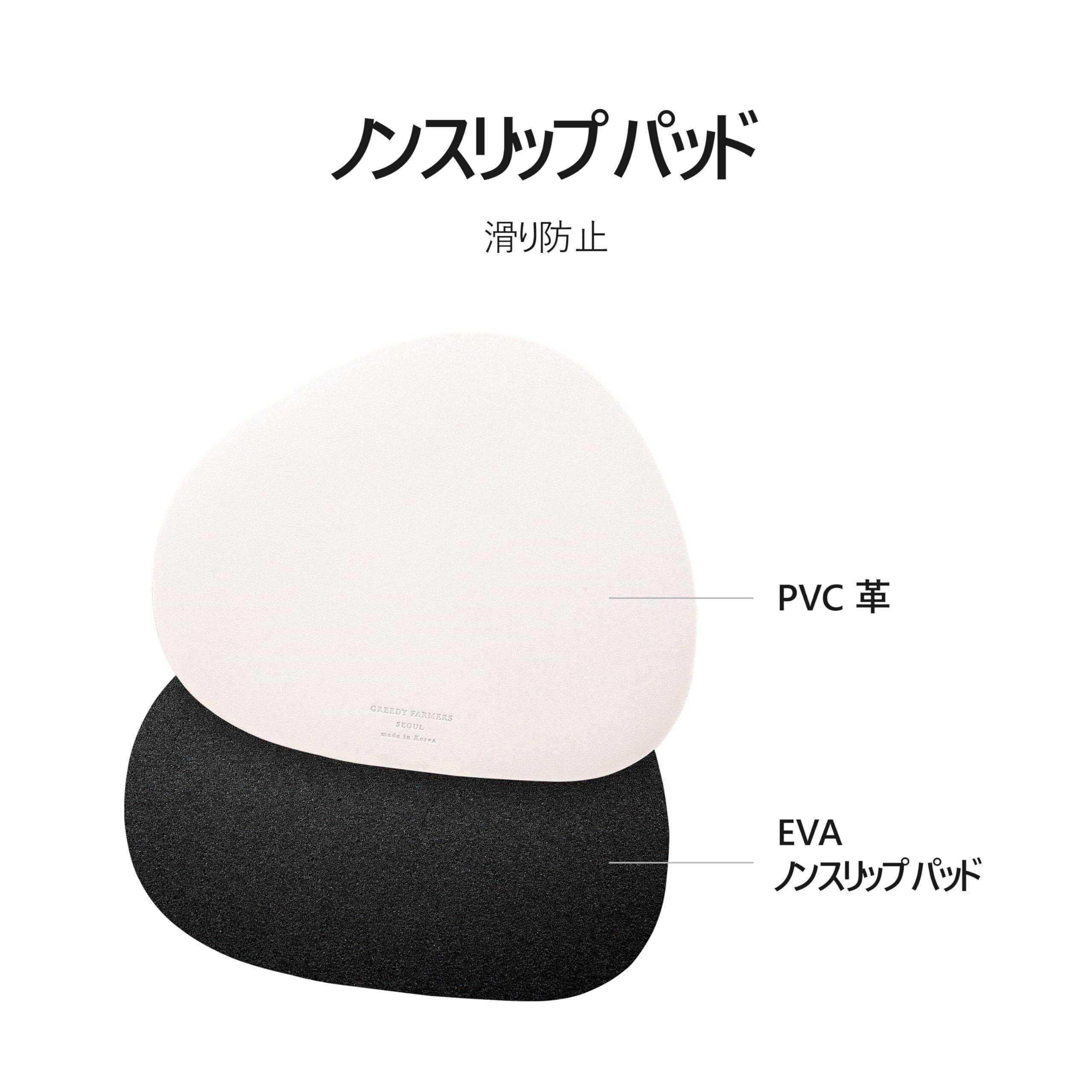 【滑り防止ノンスリップパッド】 マウスパッドの裏面に耐熱性の優れた高級ノンスリップパッドを付着しました。 机から簡単に押されたり滑ったりせず、不便なく安定感持って使用できます。 前面は雰囲気のある革の生地、裏面は実用性の高いノンスリップパッドを使用して デザインと実用性両部分を全て満たす製品です。