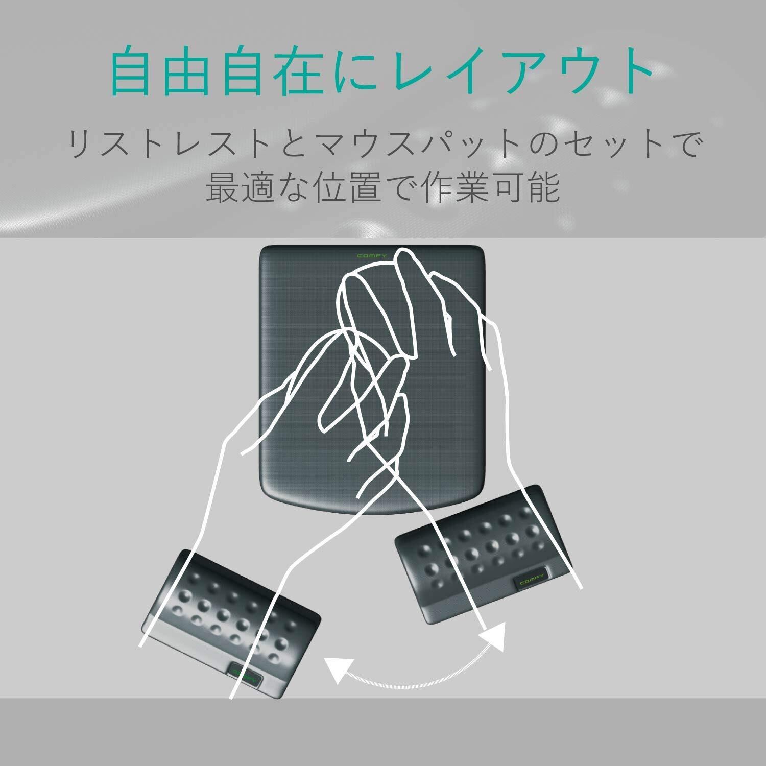 ●マウスパッドとリストレストを自由自在なレイアウトで最適な位置に移動できる、リストレスト&マウスパッド“COMFY(カンフィー)”です。●マウスパッドのマウス操作面にはポリエステルを採用し、ソフトなさわり心地と、マウスが滑りすぎない静かな操作感を実現します。●マウスパッド裏面には、デスクにぴったりと吸着してズレや移動を防ぐエラストマーを使用しています。●リストレストには、反発弾性が非常に小さく、優れた衝撃吸収性と荷重分散性能を有する低反発ポリウレタンを採用し、手首の形状にフィットして長時間のPC作業をサポートします。●リストレストはキーボードやテンキーのリストレストとしてもご利用いただけます。●リストレストには新開発のディンプル加工(凹凸加工)を施し、心地よい感触と通気性を向上しています。