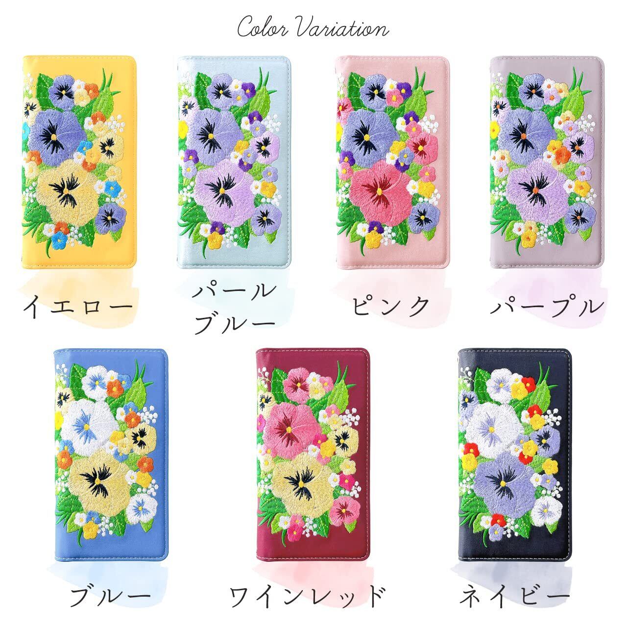 【パンジーの花束をフェルト刺繍した華やかな手帳型ケース】印刷ではなく実際に刺しゅうを施しているため、刺繍の部分が若干膨らんでいる場合がございますが、不良品ではございませんので、予めご了承ください。開閉部分にマグネットを内蔵しておりますが、磁器エラーを防ぐために磁器を弱めにしております。カチッと留まるほどではございませんので、予めご了承ください。