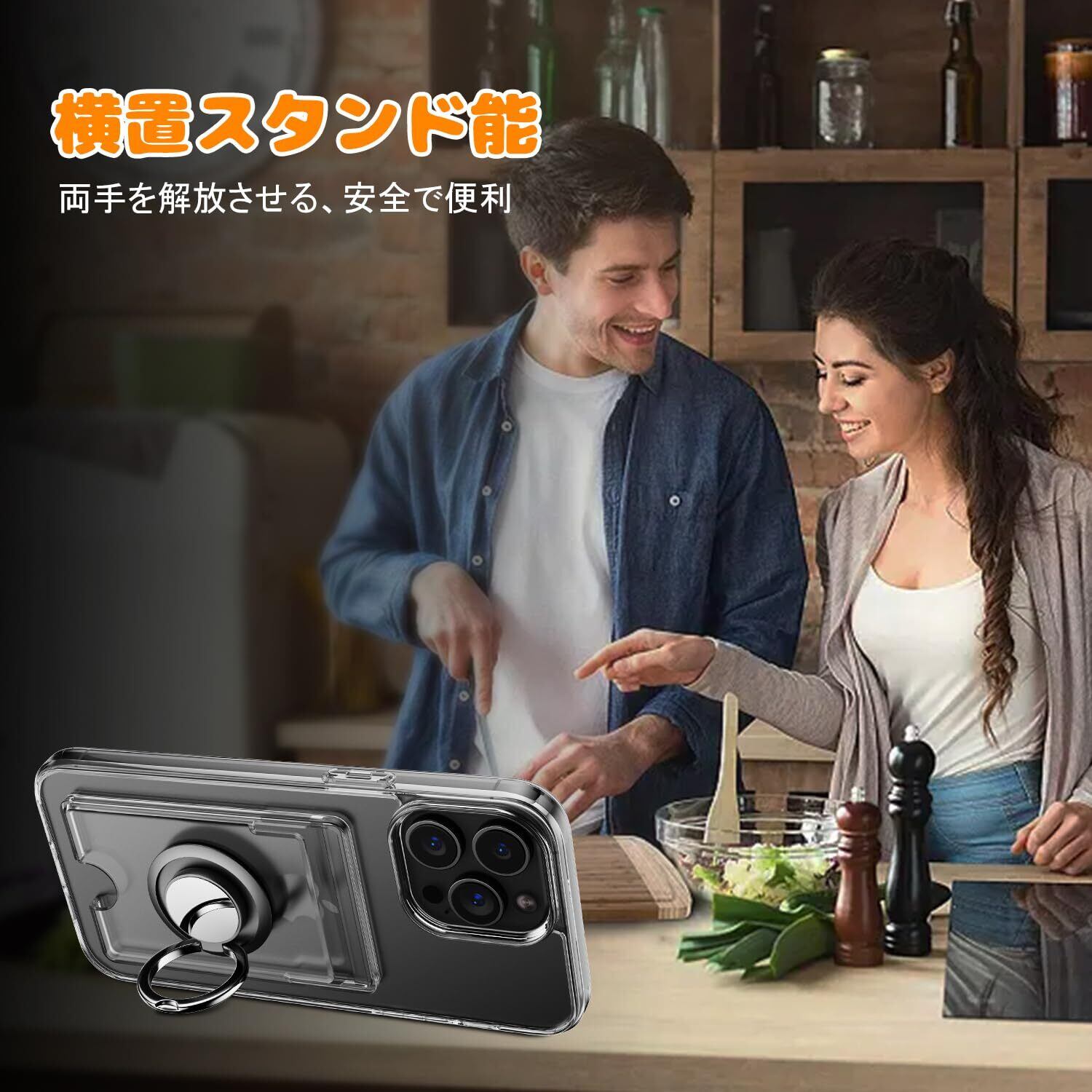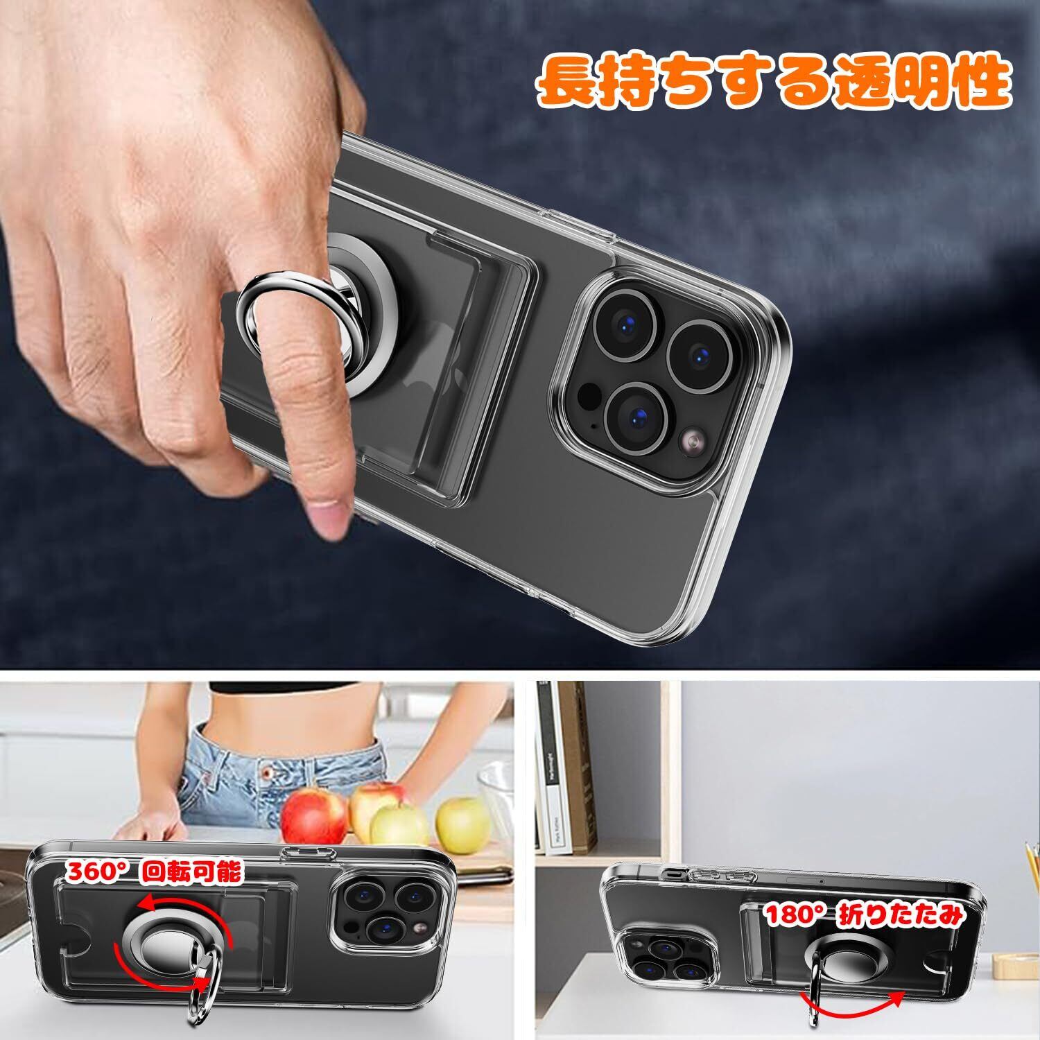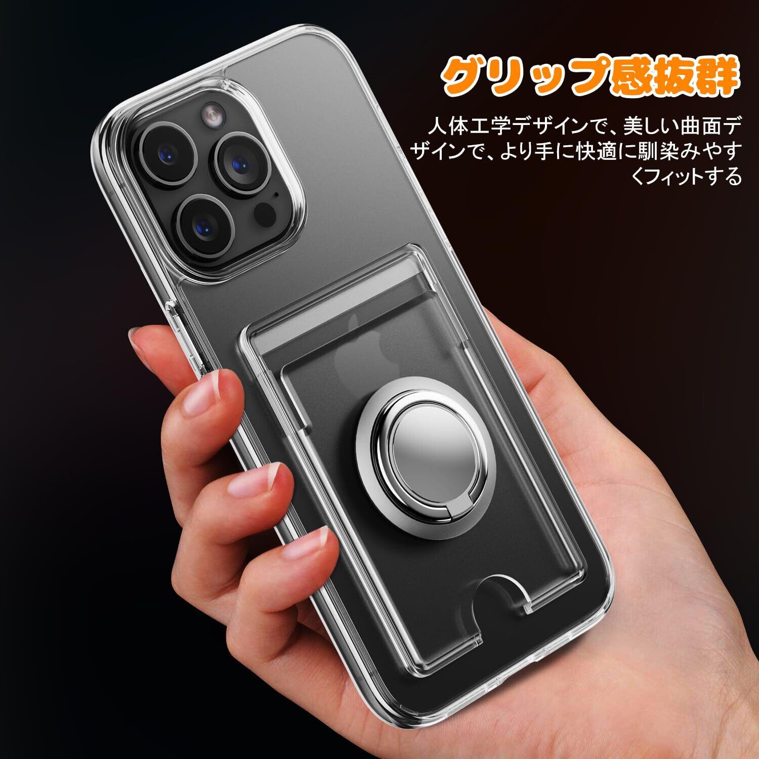 iPhone 16 Pro Max ケース 透明 カード収納 リング付き 耐衝撃保護カバー アイフォン16プロマックス スマホケース クリア シリコン スタンド機能 耐久 滑り止め (クリア) | BASE SHOP