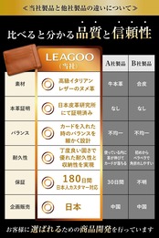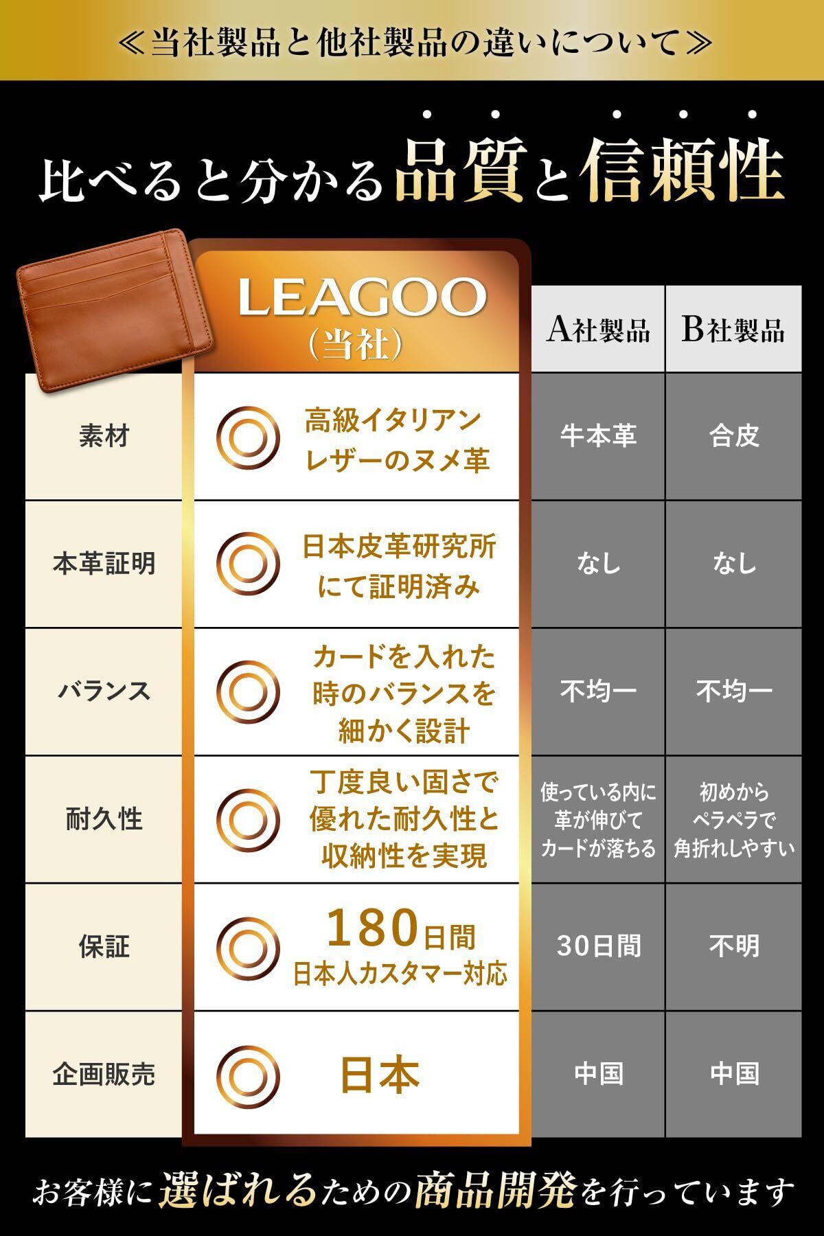 【日本皮革研究所による本革証明書取得済】一般財団法人「日本皮革研究所」による厳正な品質検査にて、天然皮革である証明書を取得しました(2023.9.20)【商品詳細】◆サイズ:約11.2cm×約8.4cm×約0.5cm ◆カラー:(1)キャメル(2)ダークブラウン(3)ブラック(4)ネイビー(5)グリーン ◆用途:カードケース・クレジットカードケース・ポイントカードケース・かーどけーす ◆ブランド名:LEAGOO 【安心の180日保証あり】万が一、商品不良があった場合、商品到着後180日以内であれば、返品・返金致します。『注文履歴』よりご連絡くださいませ。