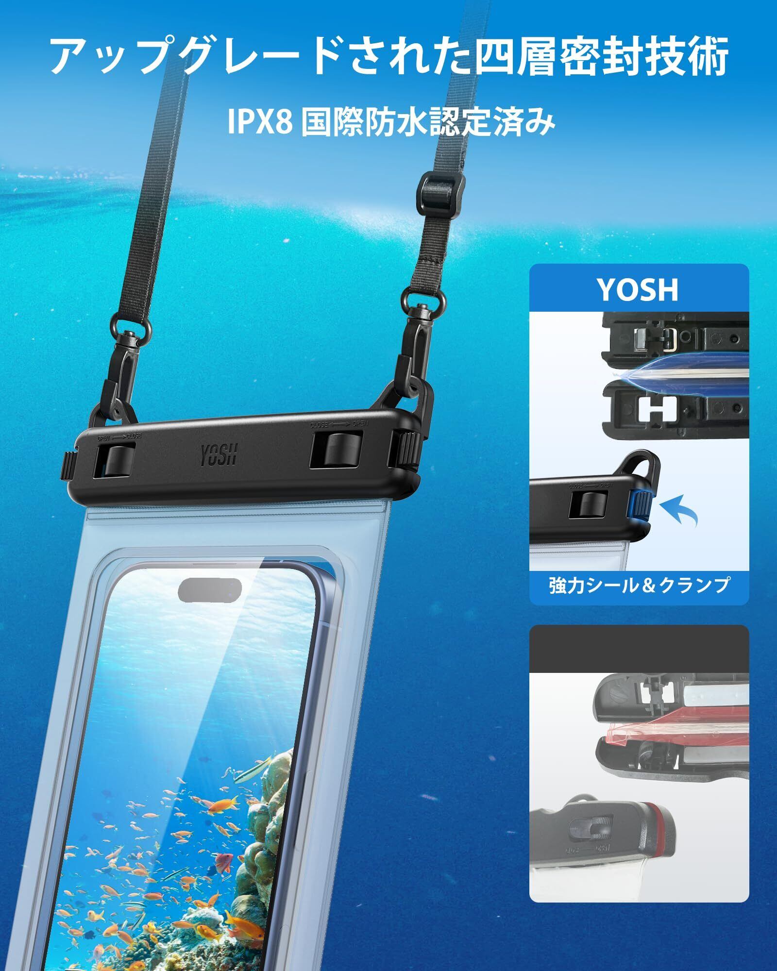 IPX8防水:YOSHスマホ防水ケースは、4層構造の枠で防水効果を強化させました。防水国際保護等級IPX8認定を獲得し、水深約30mの環境でも30分間の防水が可能です。