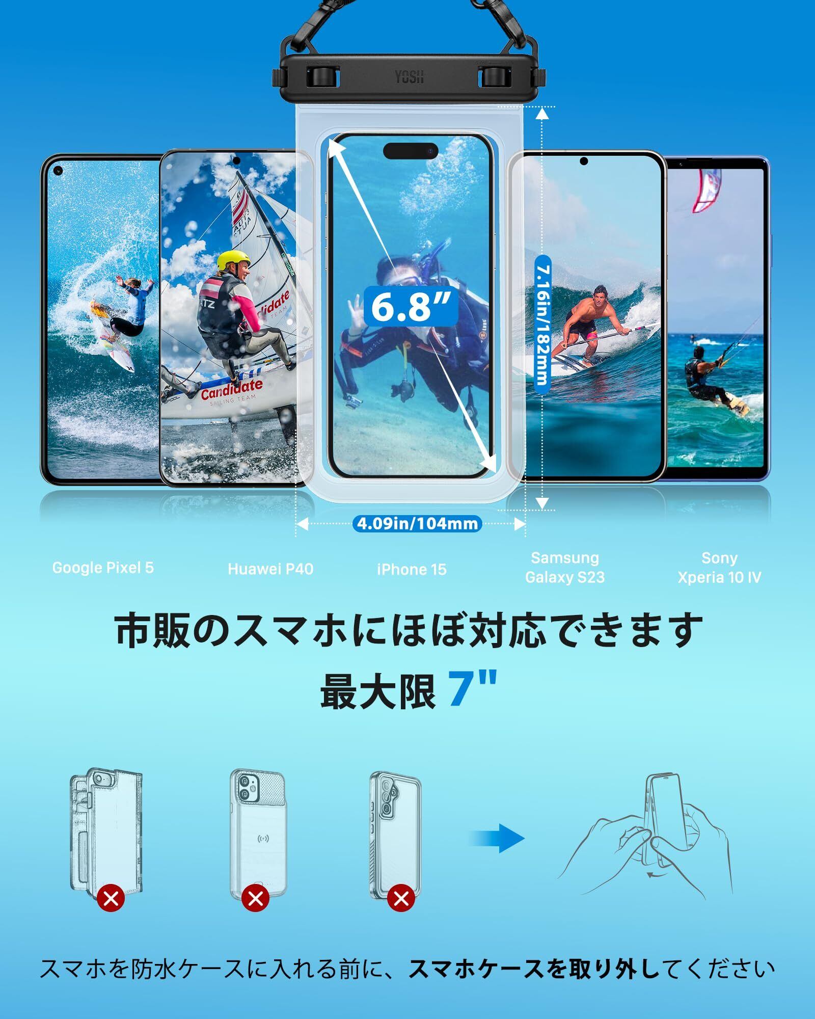 対応機種:YOSHスマホ防水ケースは、iPhone、AQUOS、ARROWS、Pixel、Xperia、Galaxyなど、スクリーンサイズ7インチ以下のスマホに対応しています。