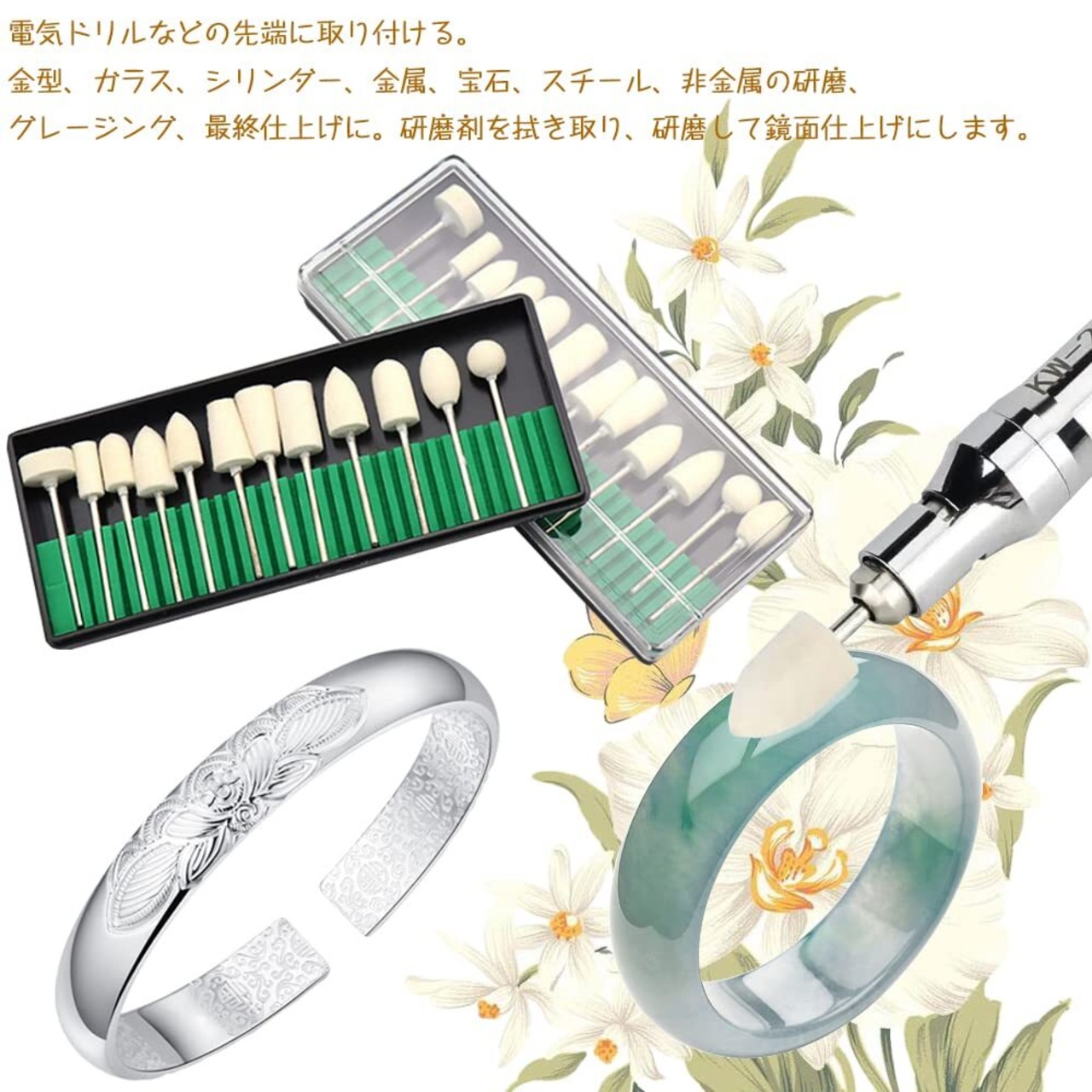 電気ドリルなどの先端に取り付ける。金型、ガラス、シリンダー、金属、宝石、スチール、非金属の研磨、グレージング、最終仕上げに。