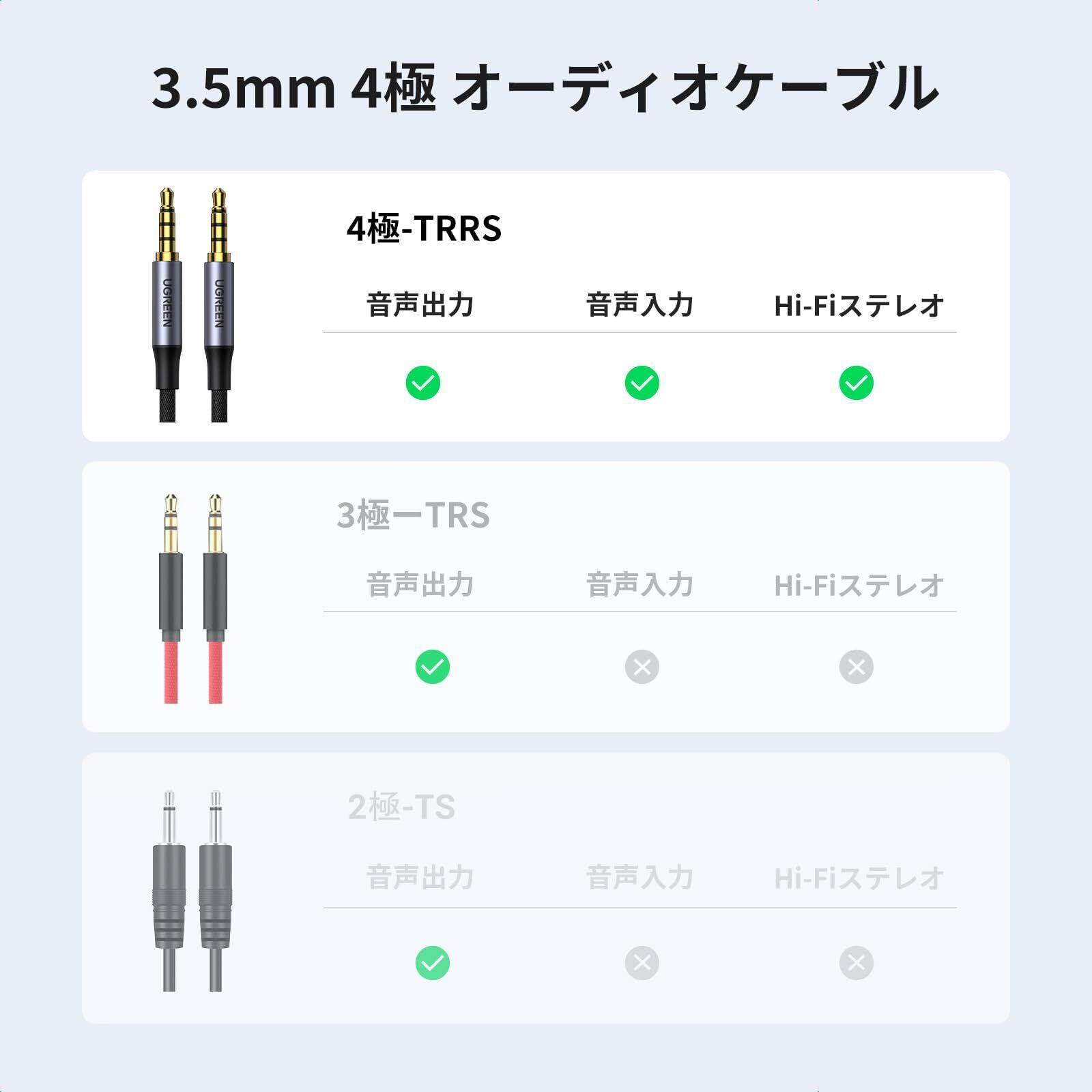 UGREEN 3.5mm オーディオケーブル 4極/TRRS ヘッドホンケーブル 3.5mm オス-オス ステレオミニプラグ イヤホンケーブル Hi-Fi音質 24K金メッキプラグ 無指向性 スマホ/PC/モニター/ヘッドホン/PS4/MP3/スピーカーに対応 2M