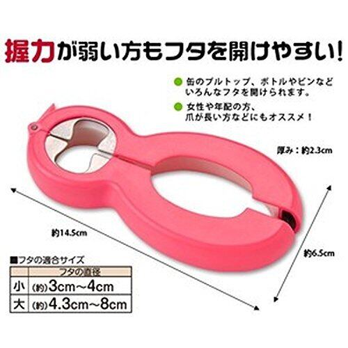 【使用方法】●缶のプルトップ:上部のツメをプルトップに引っ掛け、引き上げてください。●ペットボトルのふた:小さい方の丸い部分でフタをはさんで回してください。●栓抜き:栓抜き部分の手前側を栓のフチに引っ掛け、テコの要領で下から上へ引き上げてください。●ビンのふた:大きい方の丸い部分でフタをはさんで回してください。※フタを開ける際は、缶やビンなどを手でしっかりと押さえながら開けてください。
