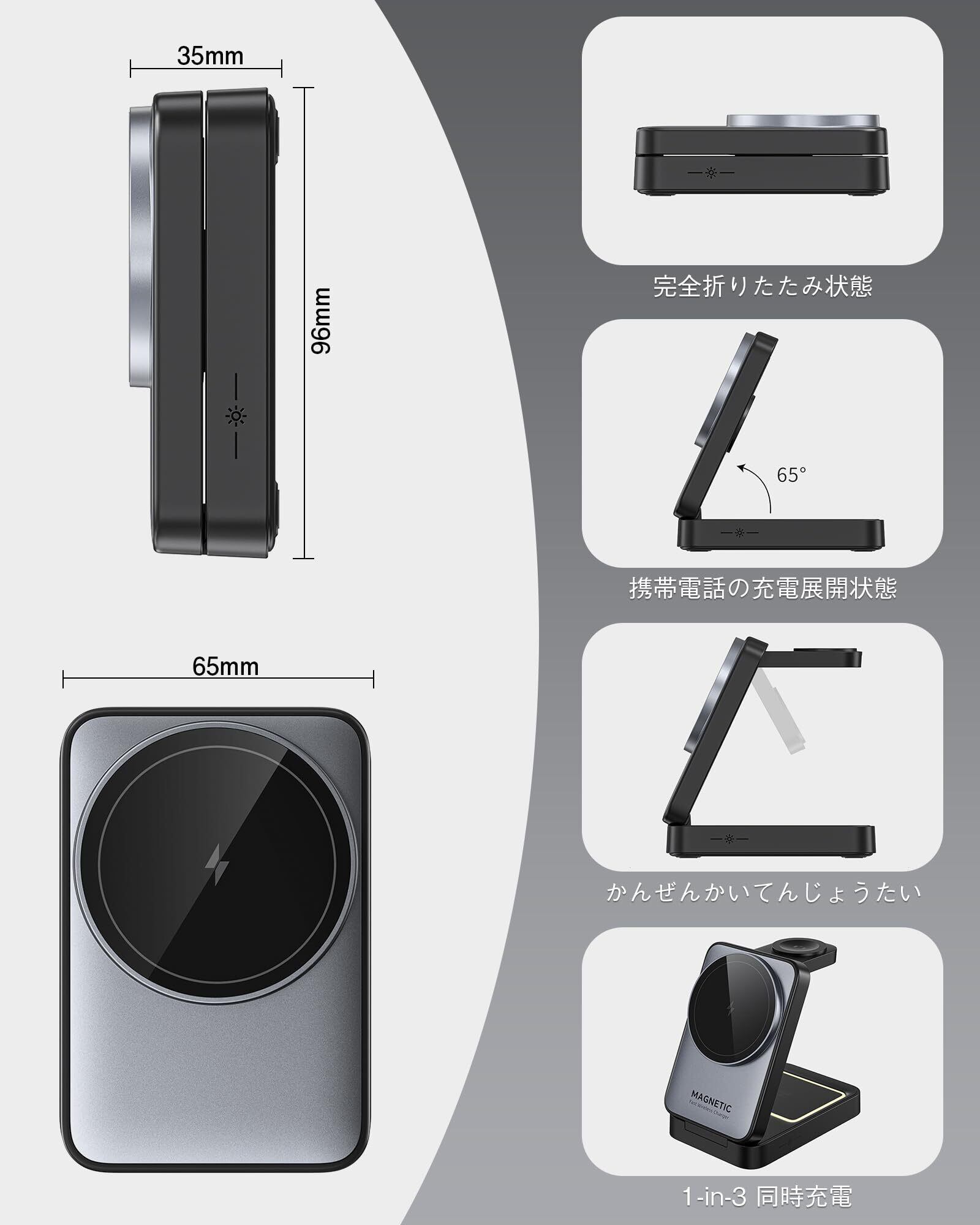 持ち運びに便利な折りたたみ式デザイン:この折りたたみ式で超コンパクトなMagSafe充電器は、わずか175グラムの重さで、マウスサイズに匹敵し、手のひらやポケットに簡単に収まります。このMagSafe充電器は、洗練された外観、高品質な素材、強力な回転軸のサポート、コンパクトで薄型のデザインを特徴としています。