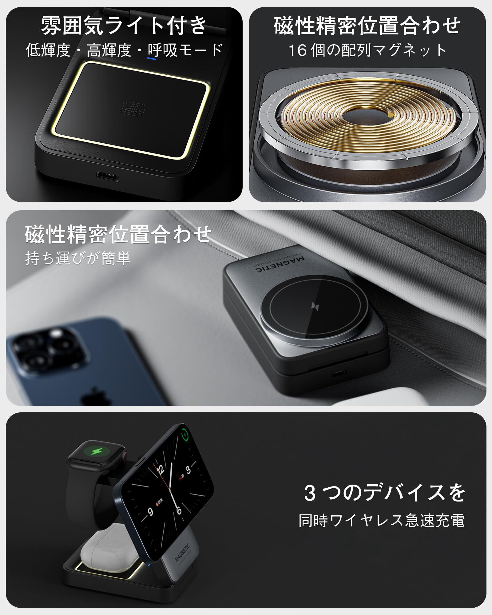 【2024新型】MAGNETIC マグネット式 3-in-1ワイヤレス充電器 MagSafe対応 iphone15/14 /13/12/ iphone Airpods/アップルウォッチ ワイヤレス出力15W/10W/7.5W/5W