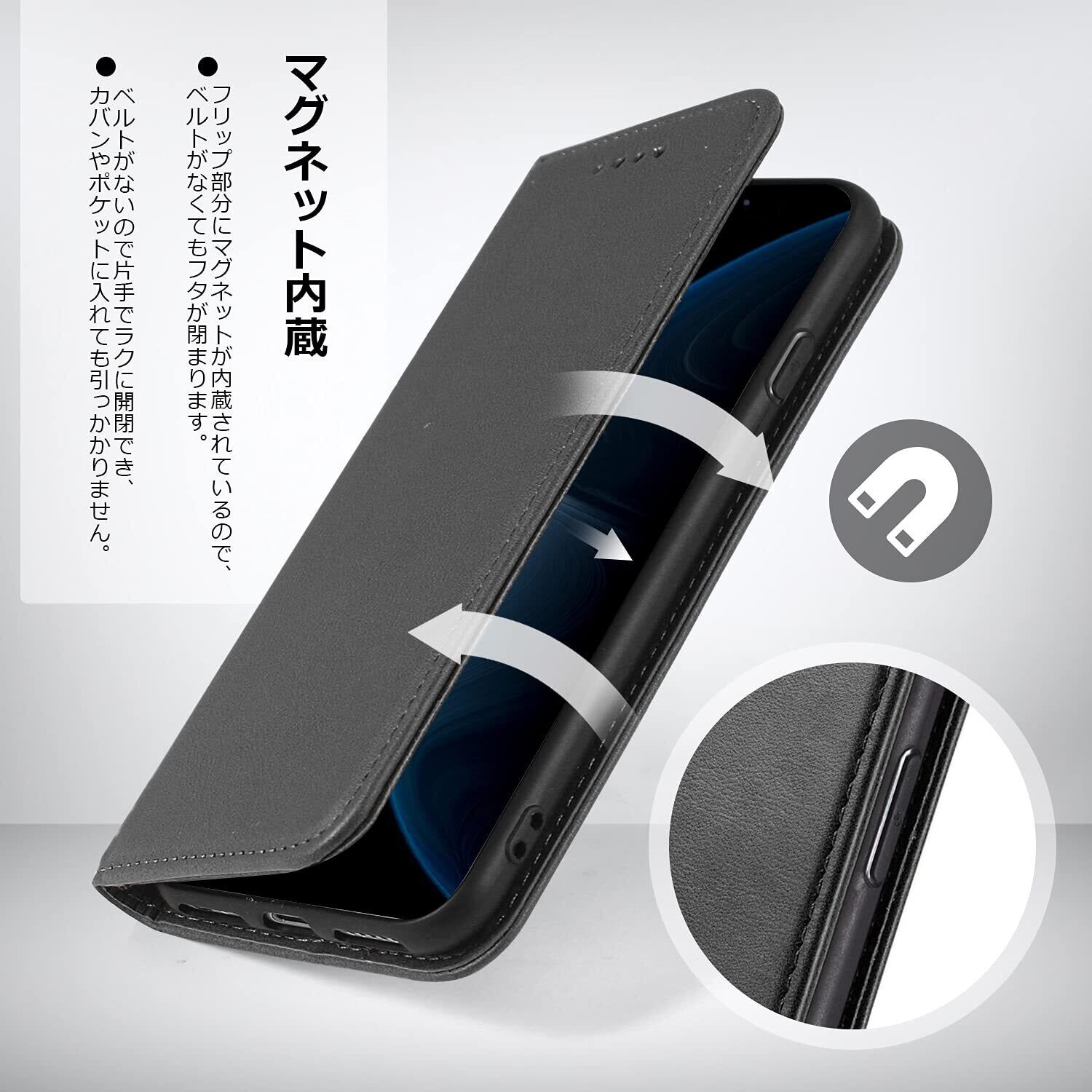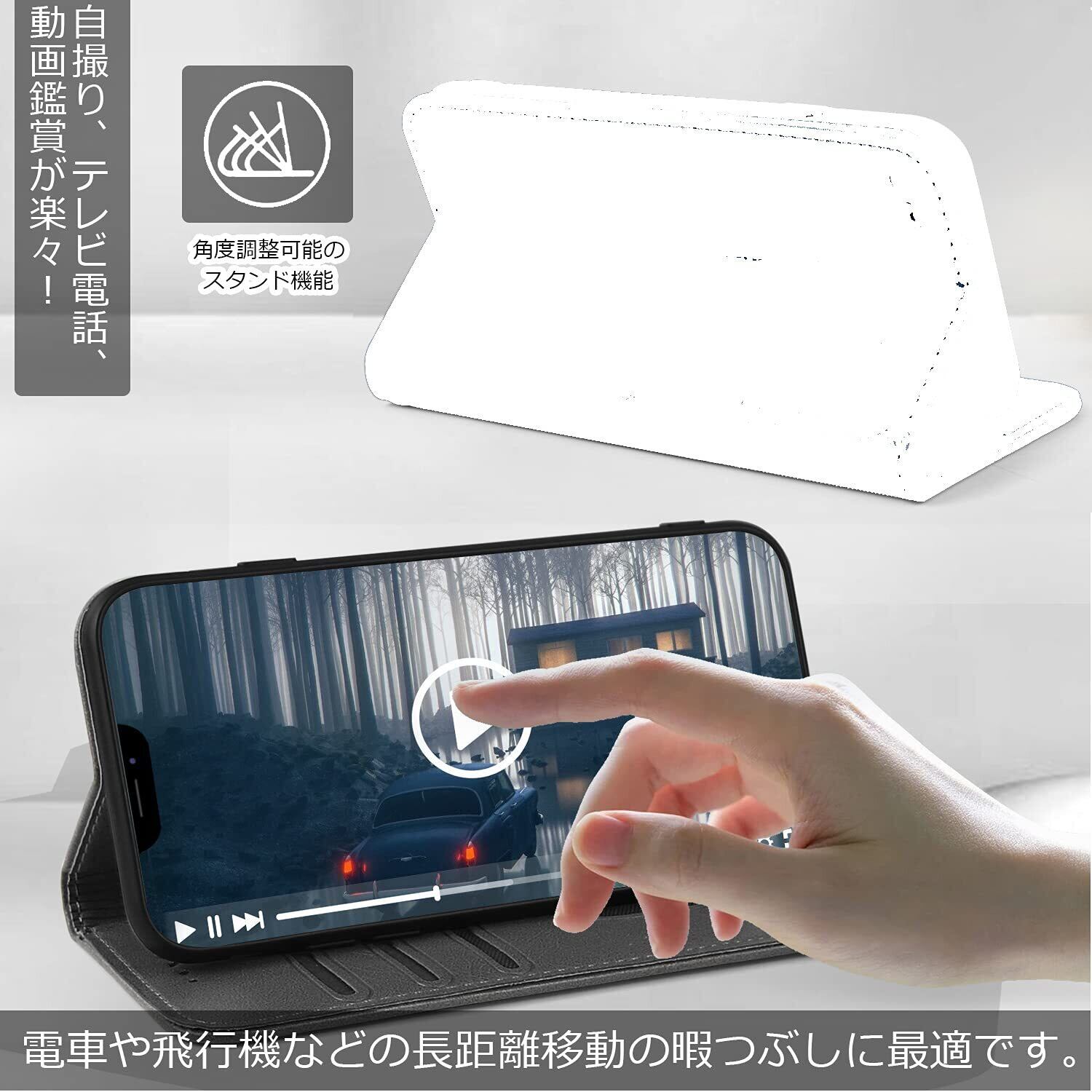 【カードポケット・横置きスタンド機能】:もちろんカードポケット付きなので、よく使うカードや定期券をいれておけばとても便利です。カードポケットの側面も収納ポケットがついていますちょっとしたメモや紙幣を収納するのに活躍します。横向きに固定することができるス夕ンド機能を搭載しているので寝ながらでも楽々動画を視聼できます。電車や飛行機などの長距離移動の際、役に立つこと間違いなしの機能です。
