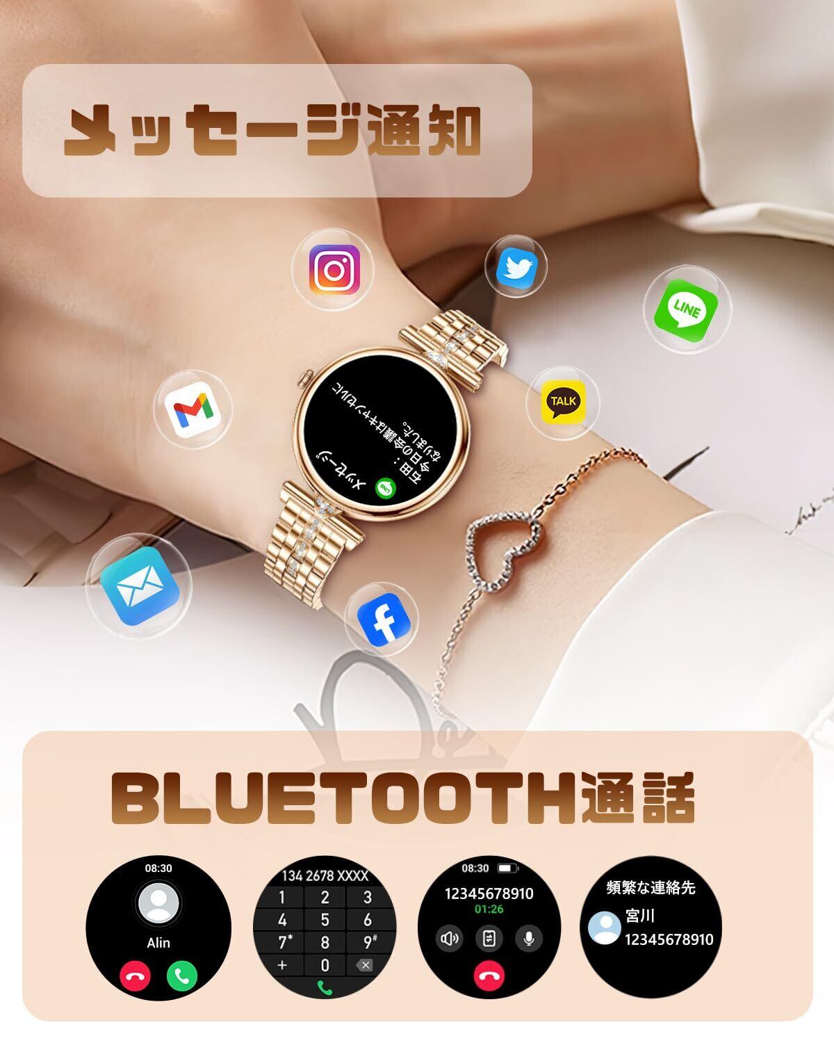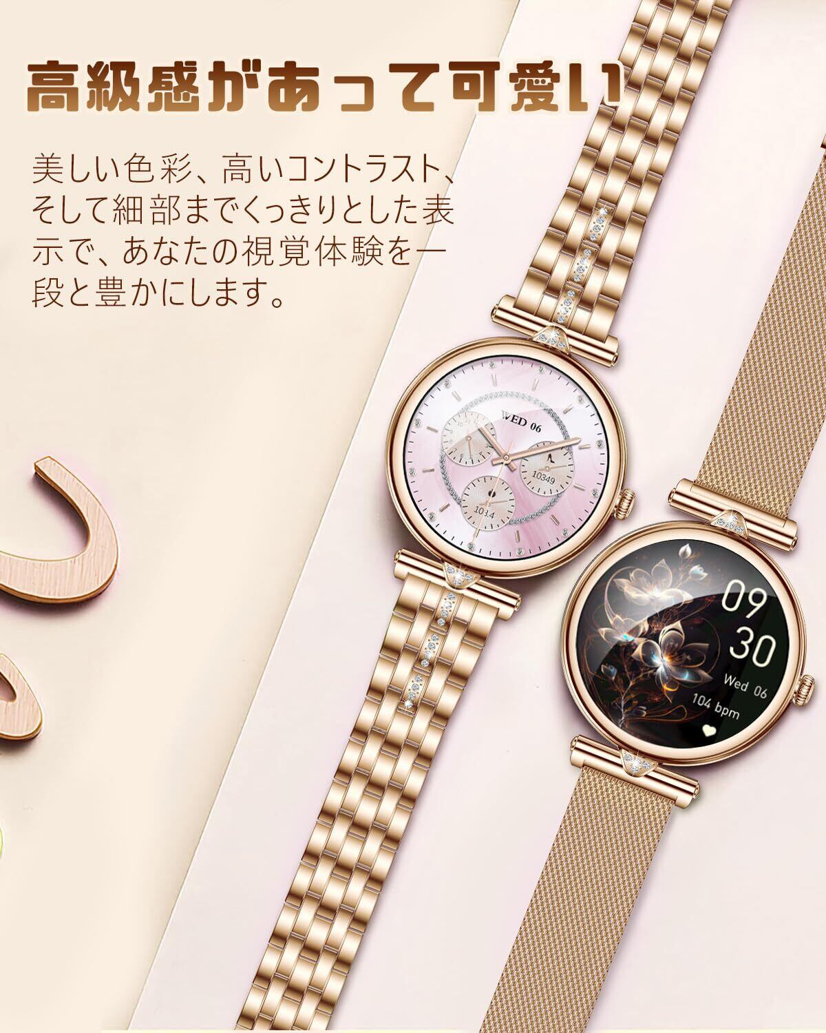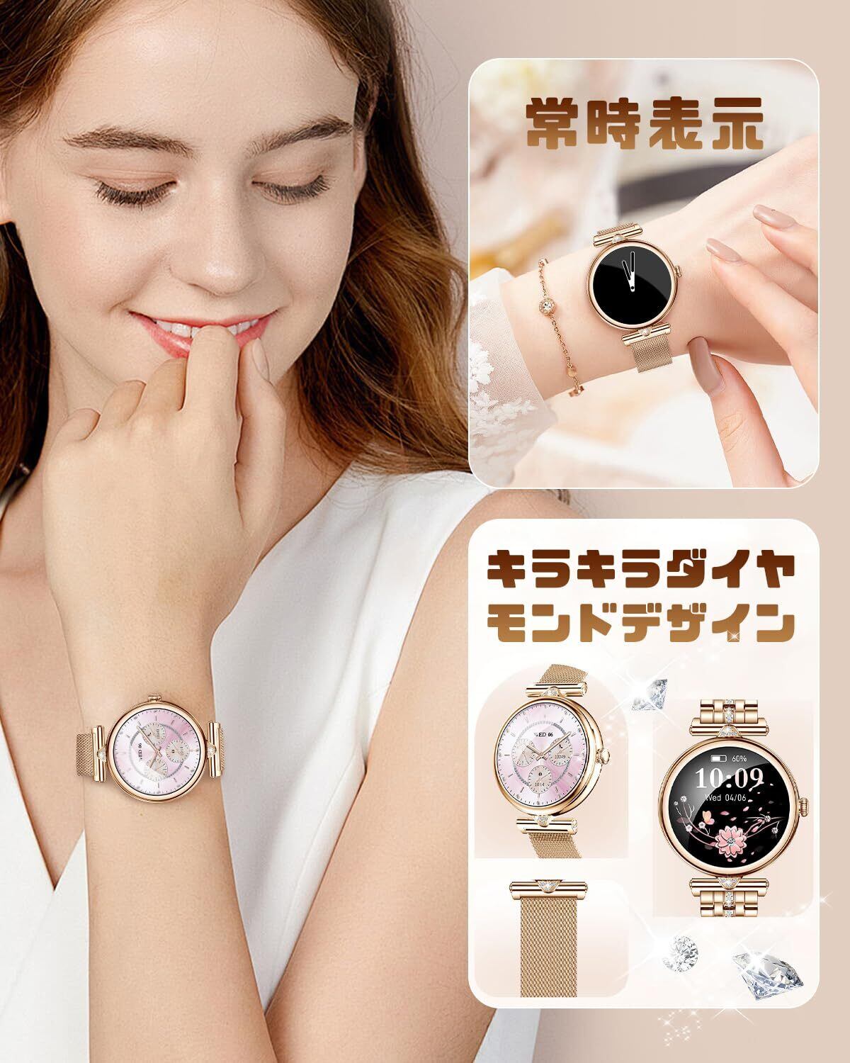 【デザインが女性向けで美しい】Orgnt スマートウォッチ レディース 丸型は、女性の手首に相応しい人気の1.28インチ、可愛い丸型ディスプレイ!高精細AMOLEDディスプレイを採用しており、晴天下でもストレスなく視認・操作することが可能。厚みはたった9.5mmです!12時と6時にダイヤモンドデザインを採用し、キラキラをイメージしました。おしゃれで可愛いスマートウォッチ!