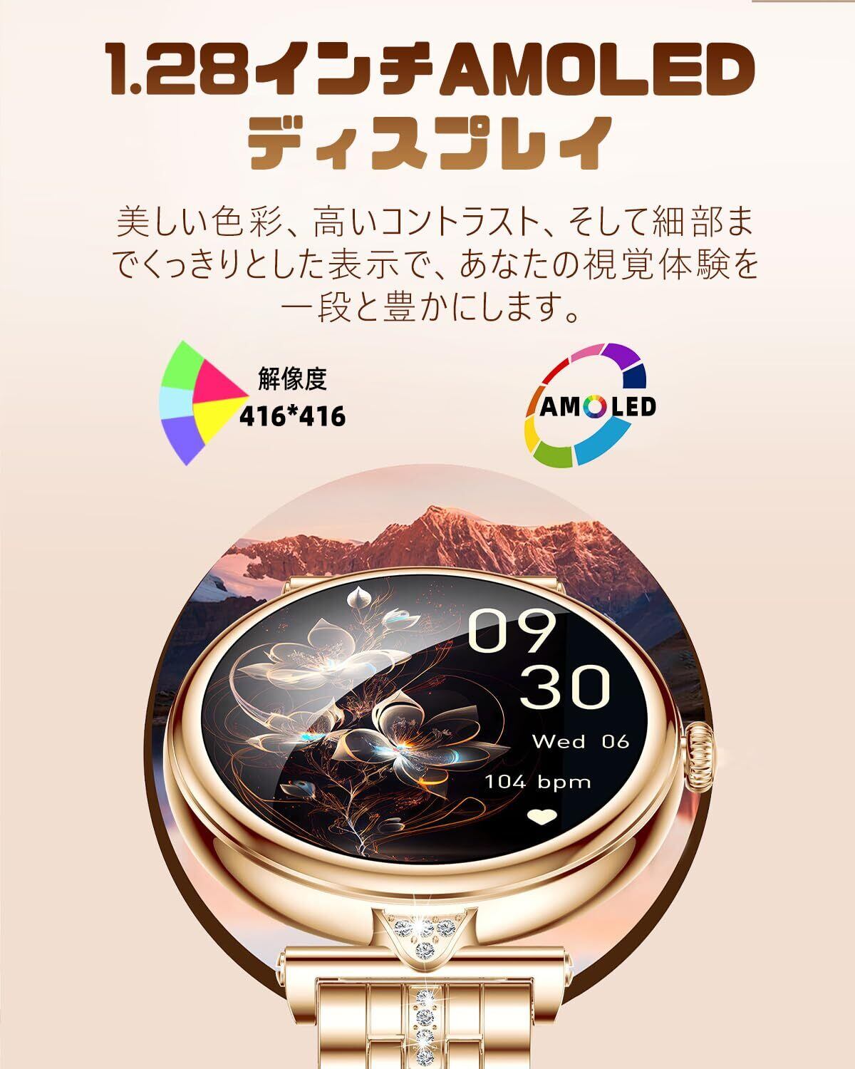 スマートウォッチ レディース 1.28インチ AMOLED 小さめ 腕時計 おしゃれ 可愛い 丸型デザイン 常時表示 Bluetooth5.2通話 100種類運動モード LINE/Gmail/着信通知 IP68防水 Smart Watch アンドロイド対応 アップル対応 付属ベルト*3本 日本語説明書付き
