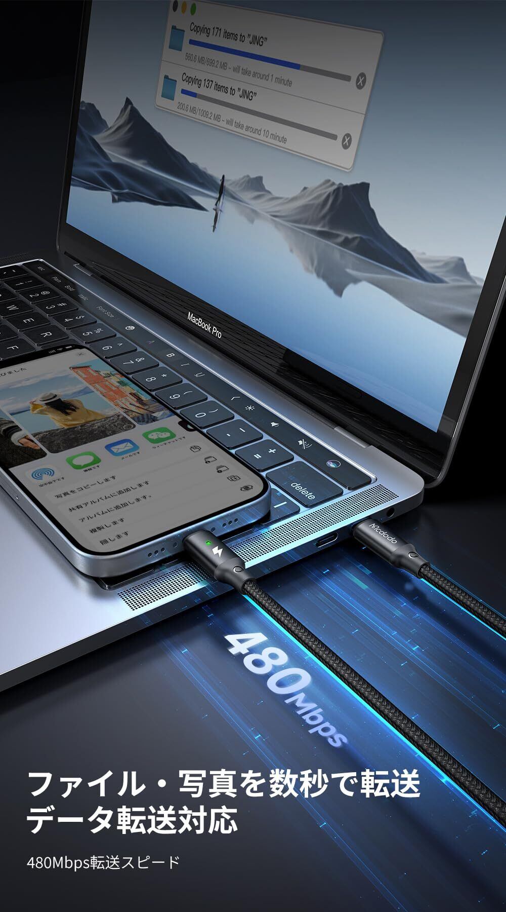 【30分頃 充電60%、iPhoneデバイス急速充電対応】:PD充電器を組み合せて、iPhone 14/13/12/11/XS/XR/SE/8など機種を高速充電可能。※上記のテストデータはMcdodo実験室からのものです。ファイル・写真を数秒で転送、480Mbps転送スピード。