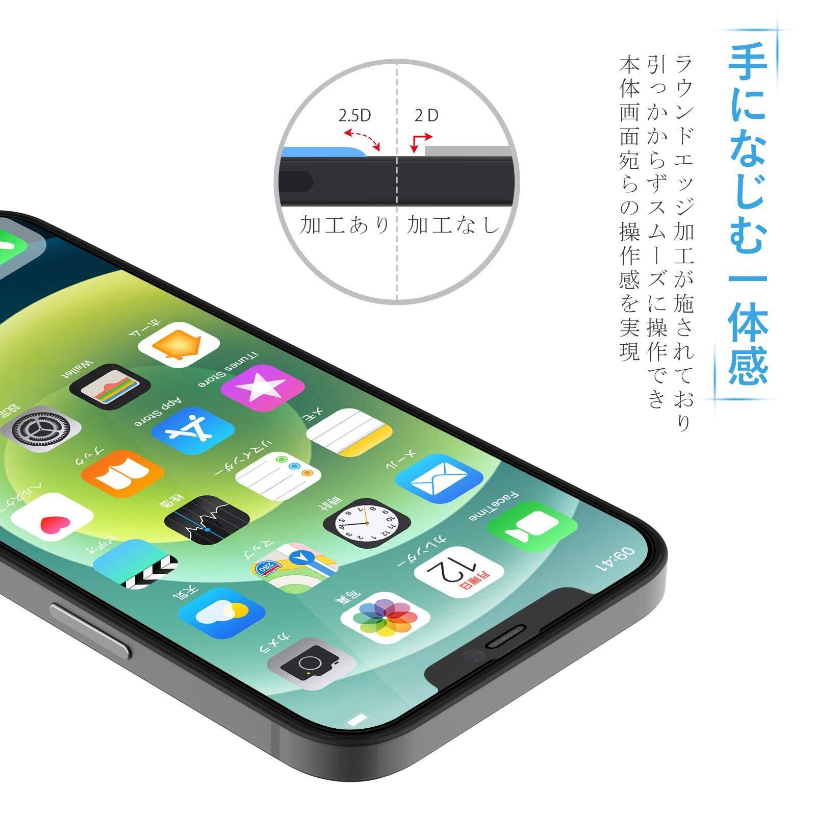 特徴 高透過率 / 2.5Dラウンドエッジ加工 / 9H硬度ガラス / 優れた耐衝撃性 / 飛散防止 / 全面保護 / ケースと干渉せず / 初心者でも貼付簡単