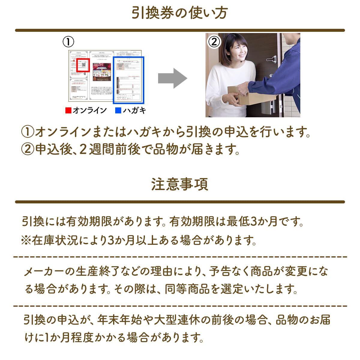 ギフト箱の中に引換券(B5サイズ)が三つ折りの状態で入っています。 受け取った方は「web申込」または「ハガキ申込」で引換申込を行います。申込後、約2週間程度で品物が届きます。送料は発生しません。 ※web申込に限り、申込日より10日以降で受取り日の指定ができます。