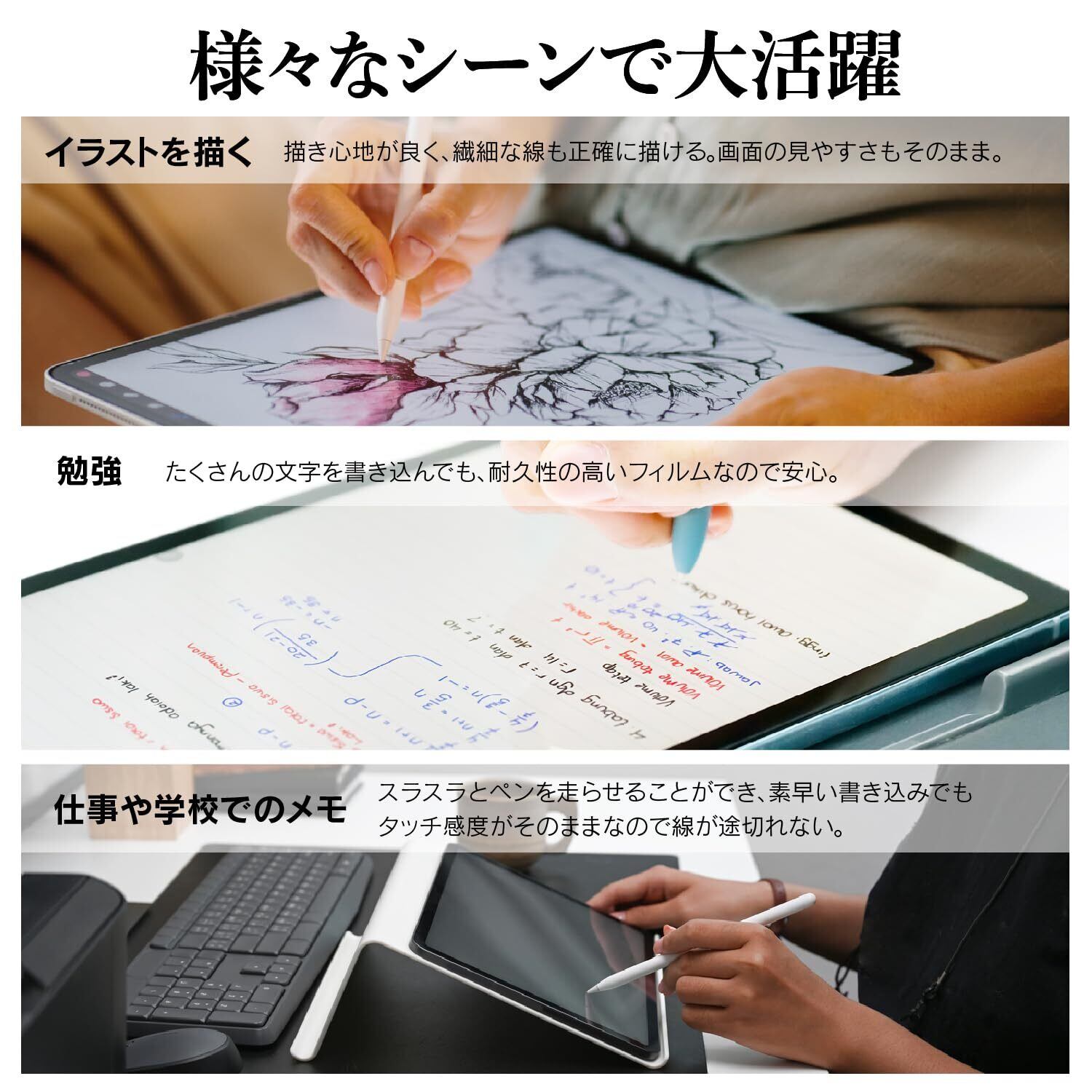 【ペン先摩耗低減】:特殊コートにより、ペン先摩耗度を従来の50%に軽減しております。【反射防止】:アンチグレア加工で光の反射や映り込みを防止します。【表面硬度3H】:3Hの鉛筆でひっかいても傷がつかない硬度で、画面への傷を防止します。【耐久性】:500gのスタイラスペンでの耐擦傷性試験にて、5000回の試験を行っても品質の劣化は認められませんでした。
