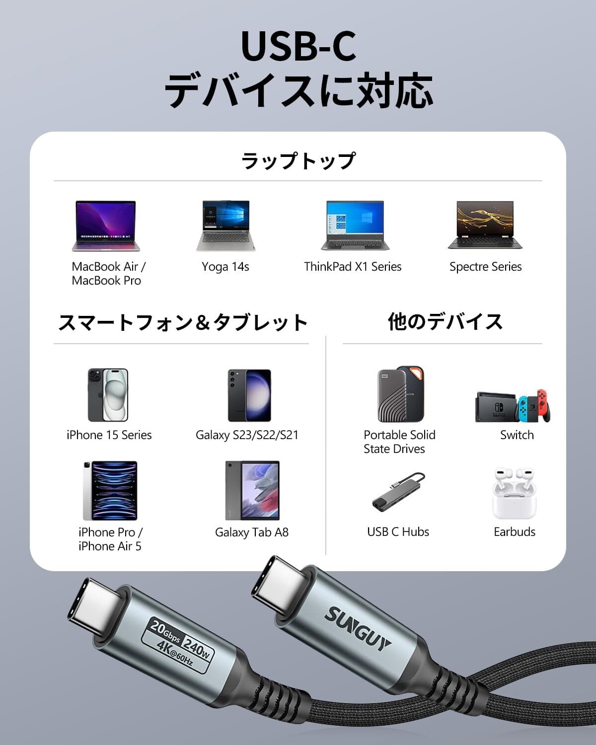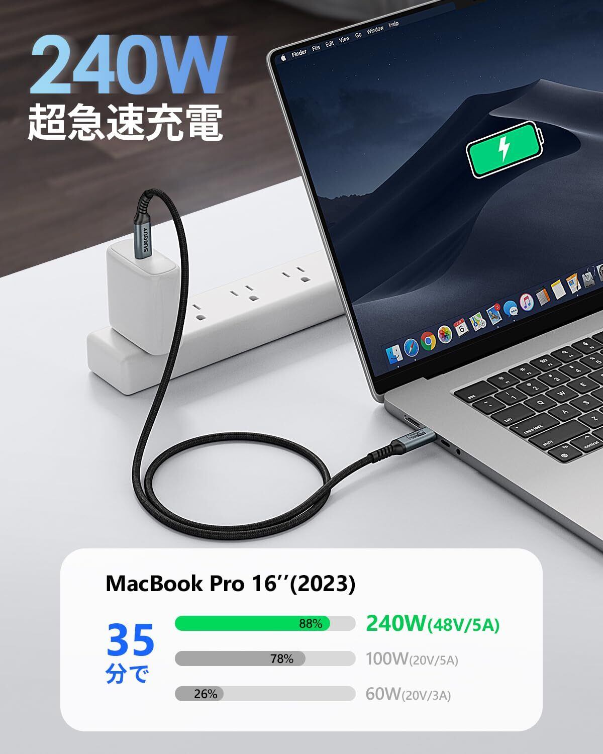 【240W超高速充電対応】このUSB Cケーブルは、PD 3.0/2.0とQC 3.0/2.0に対応し、最大240W(48V/5A)での超高速充電を実現。iPhone 15を15分で50%、iPad Proを20分で60%、MacBook Proを30分で70%迅速に充電可能です。PD対応のデバイスと充電器が必要です。