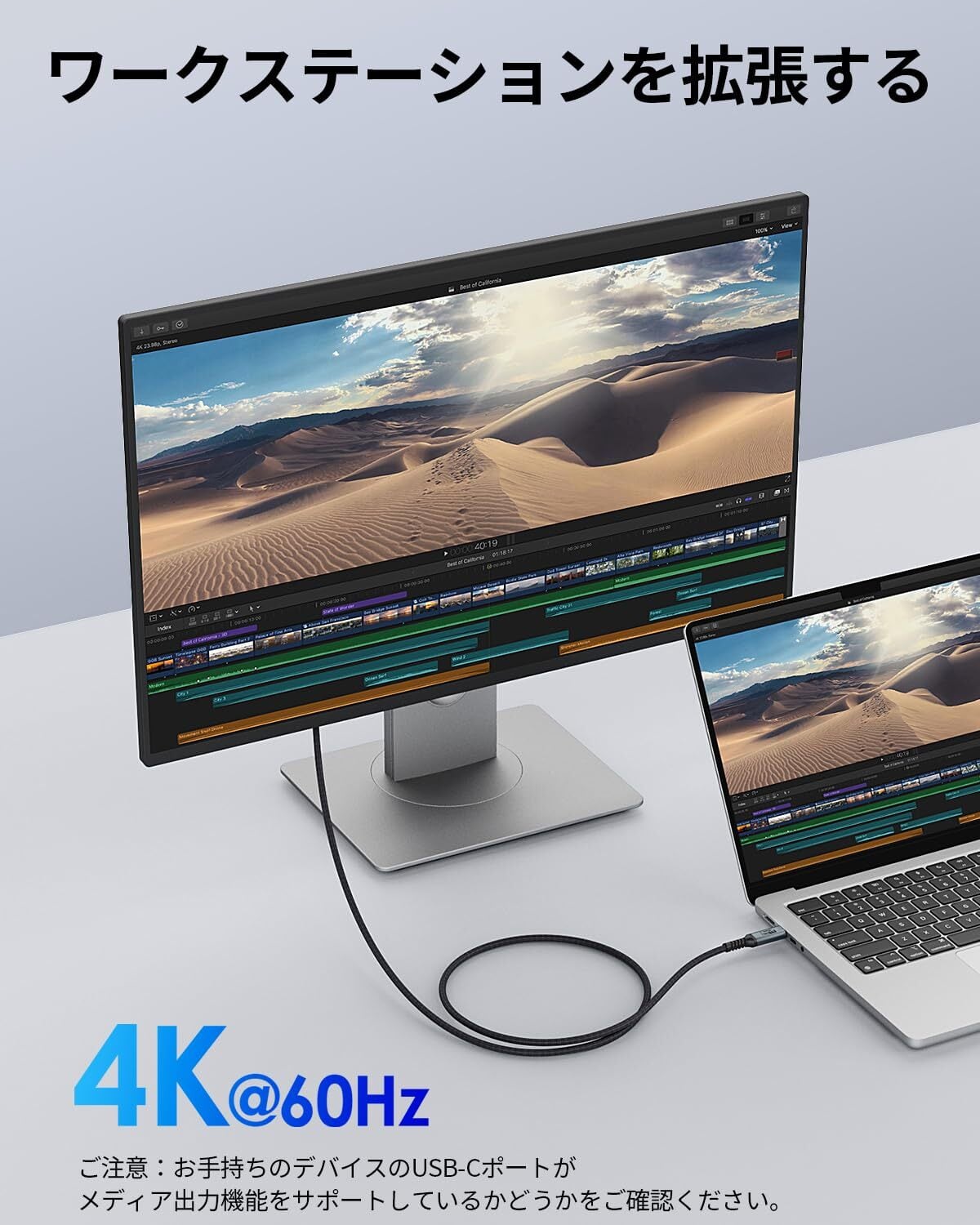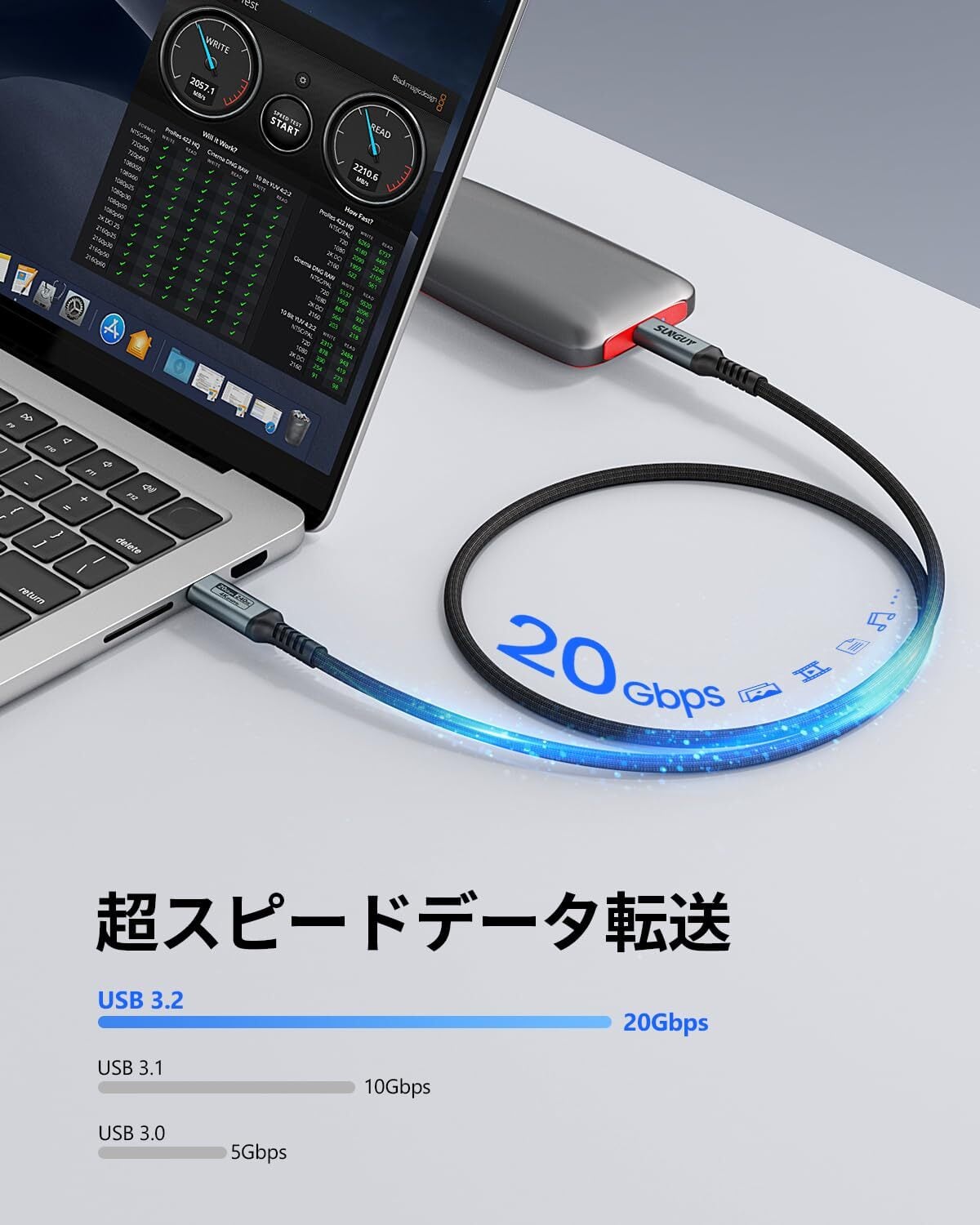 【最大20Gbpsデータ転送 & 4K@60Hzビデオ出力】USB 3.2 Gen 2x2採用のCタイプケーブル。20Gbps超高速転送で、大容量ファイルやHD映画が即座に転送可能。4K@60Hzビデオ出力により、映画やゲーム、プレゼンテーションで鮮明で滑らかな映像体験を提供します。