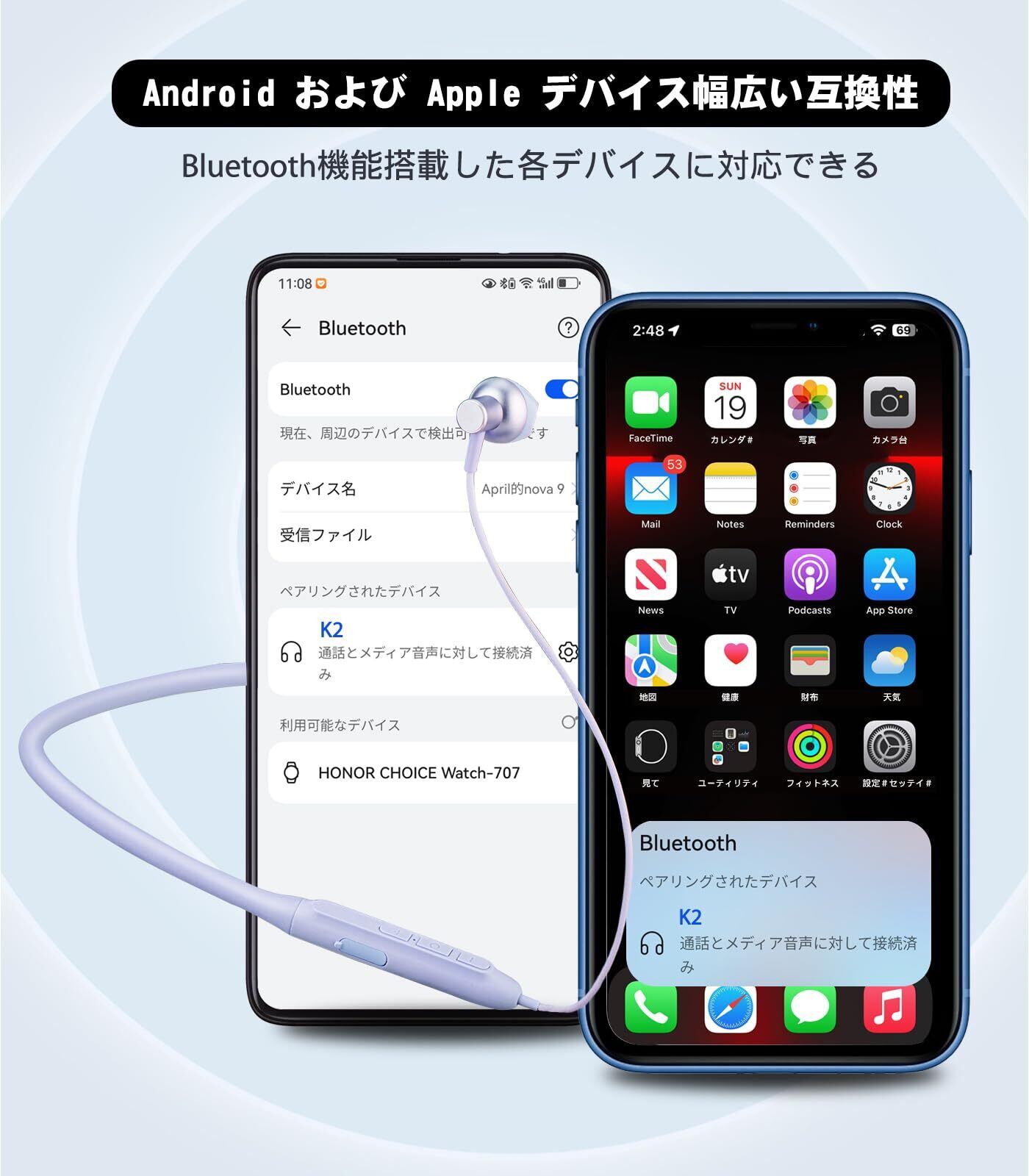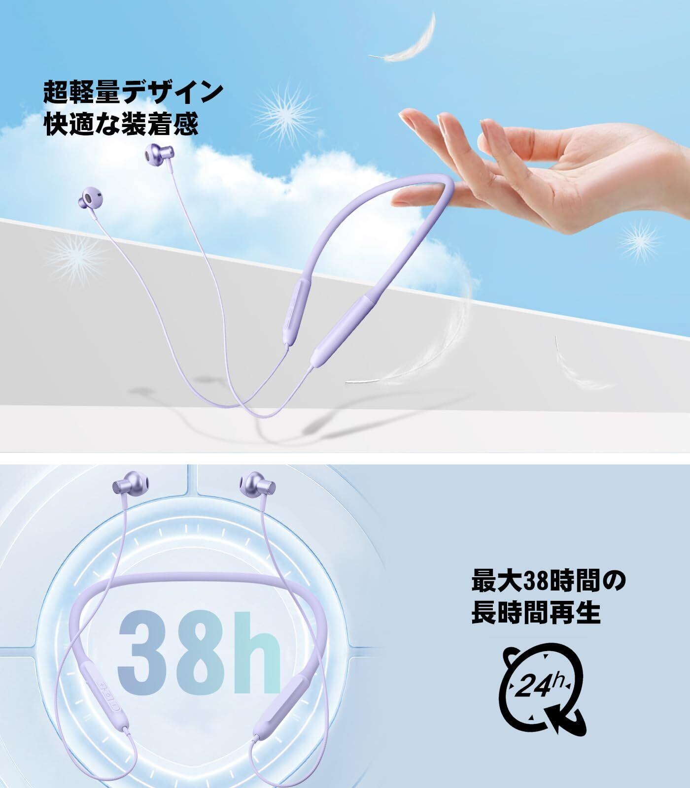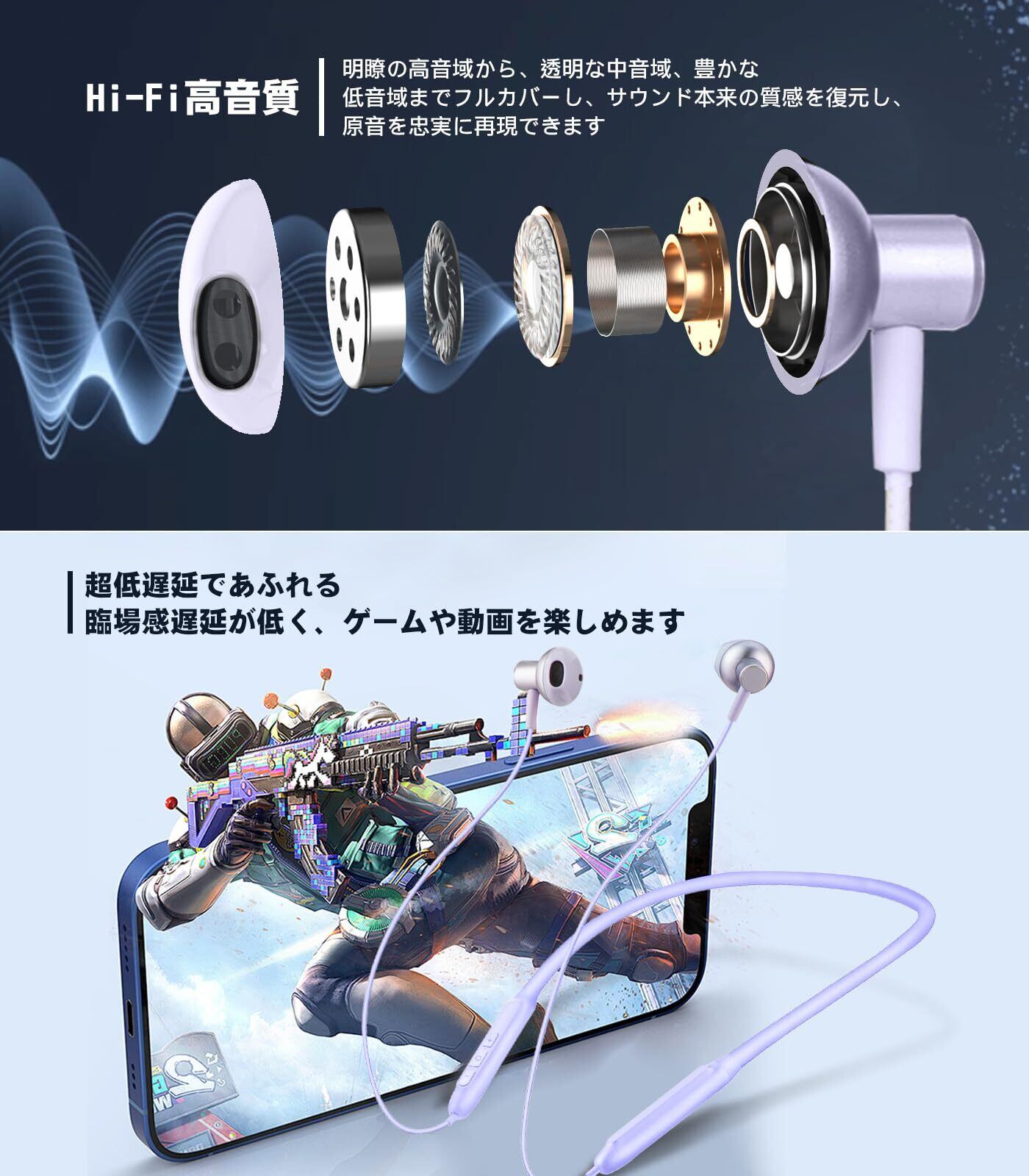 【2024革新 ネックバンド型 イヤホン・Bluetooth 5.3】Bluetooth イヤホン ネックバンド型 HQP 首掛け ワイヤレスイヤホン ブルートゥース CVC8.0ノイズキャンセリング Type-C急速充電 Hi-Fi音質 イヤホン Bluetooth ネックバンド 自動ペアリング ハンズフリー通話 IPX7防水 超軽量 技適認証済 iPhone/Android対応 パープル