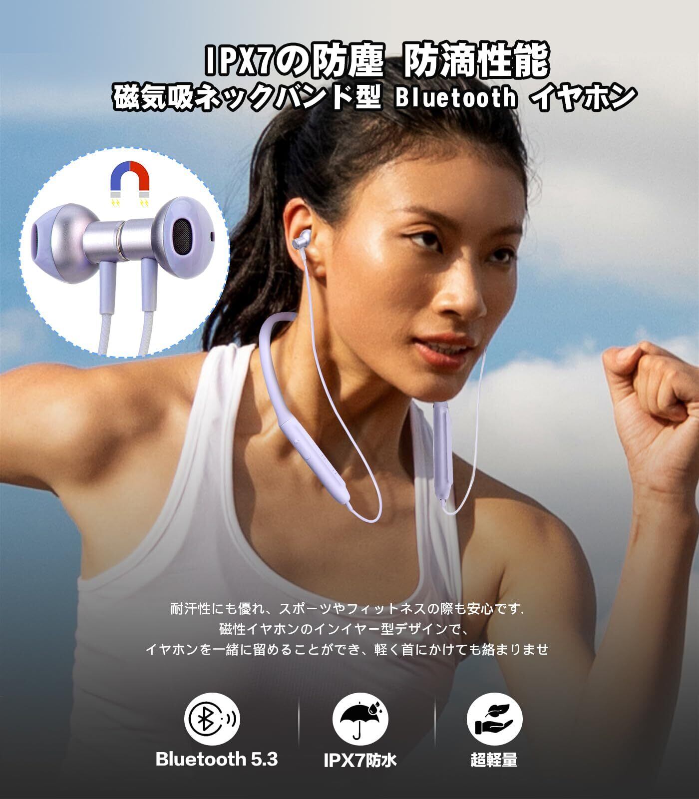 【超軽量設計・IPX7防水】ネックバンド型 イヤホンはわずか30gの重さで、耳に圧力を感じることなく長時間装着しても疲れを感じません。またIPX7防水性能を備えて、汗や水しぶきに強い、突然の雨や、激しい運動の汗で濡れてもBluetooth イヤホンを安心して使えます。ジョギング、ランニング、ヨガ、スポーツ、ジム、サイクリングなどに適用します。