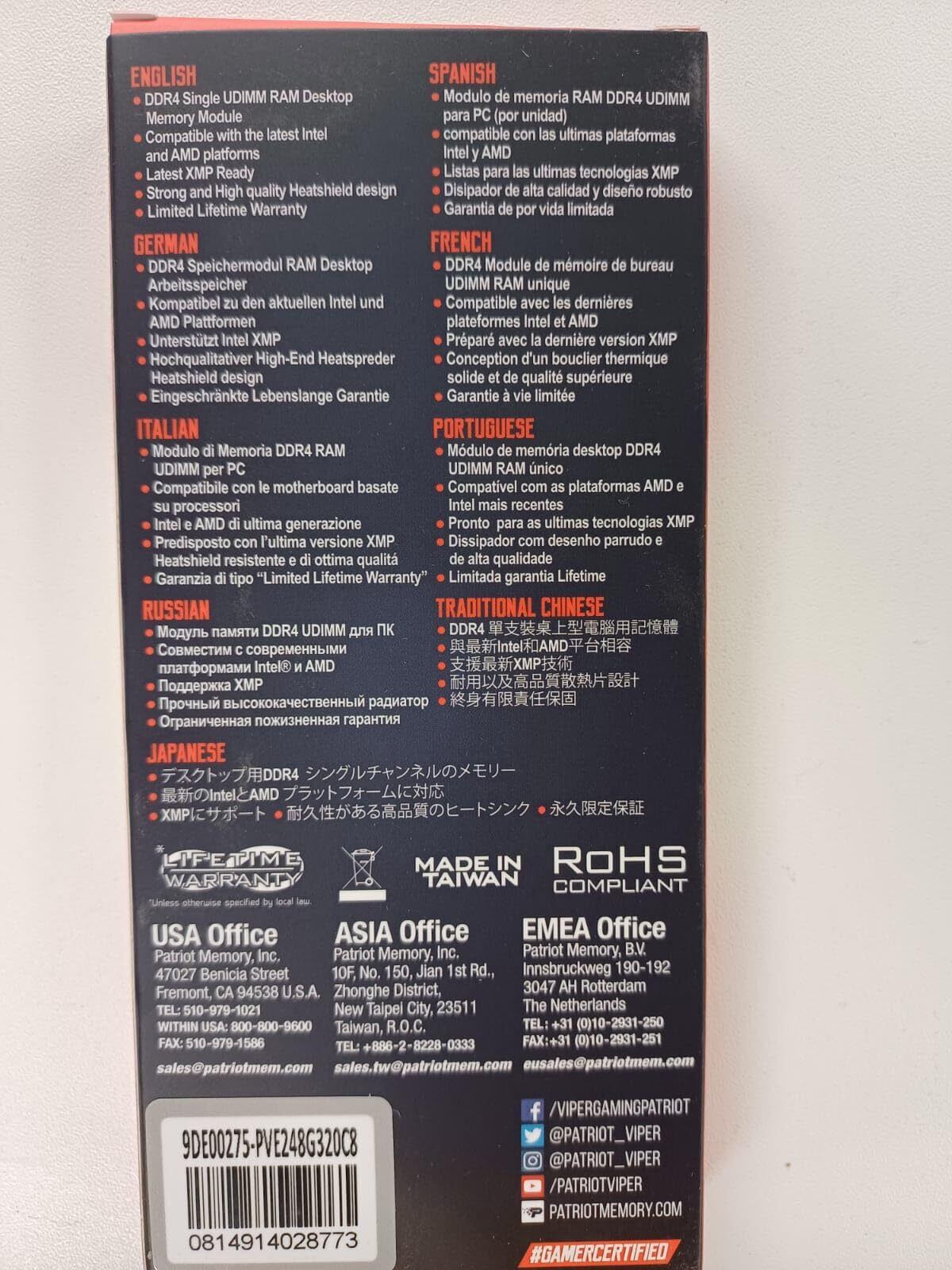 Patriot Memory Viper Elite II DDR4 3200MHz 8GB (8GB x 1枚) デスクトップ用メモリ - PVE248G320C8