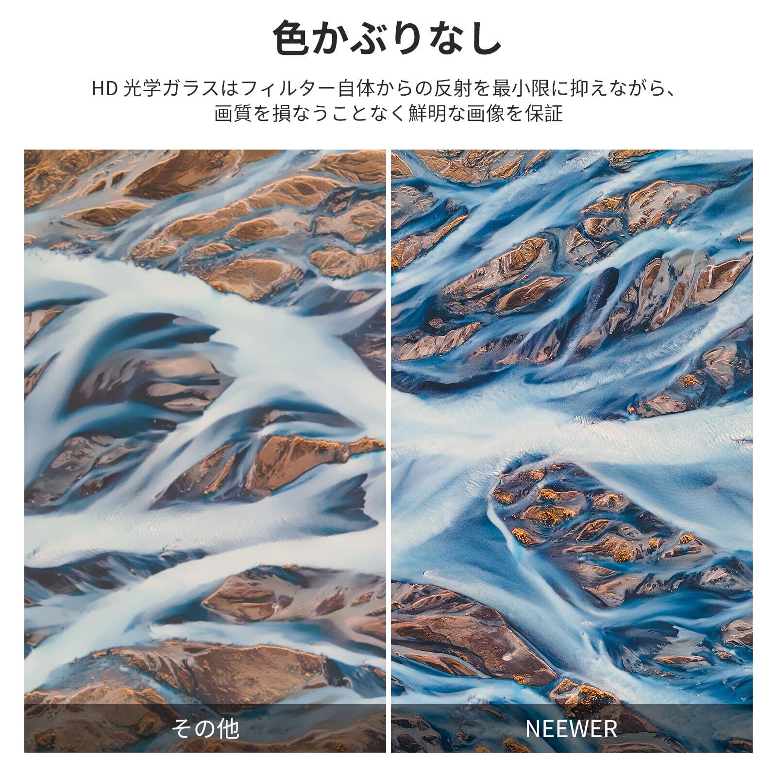 【柔軟なバランス露出制御】1~5ストップの減光を備えたND2-32フィルターは、適度な照明条件に適しており、より遅いシャッタースピードとより広い絞りを可能にします。5~9ストップの減光を備えたND32-512フィルターは、明るい照明状況に適しています。強い光の中でもシャッタースピードを長くすることができ、滑らかな滝やぼやけた動きなどの創造的な効果を提供します。