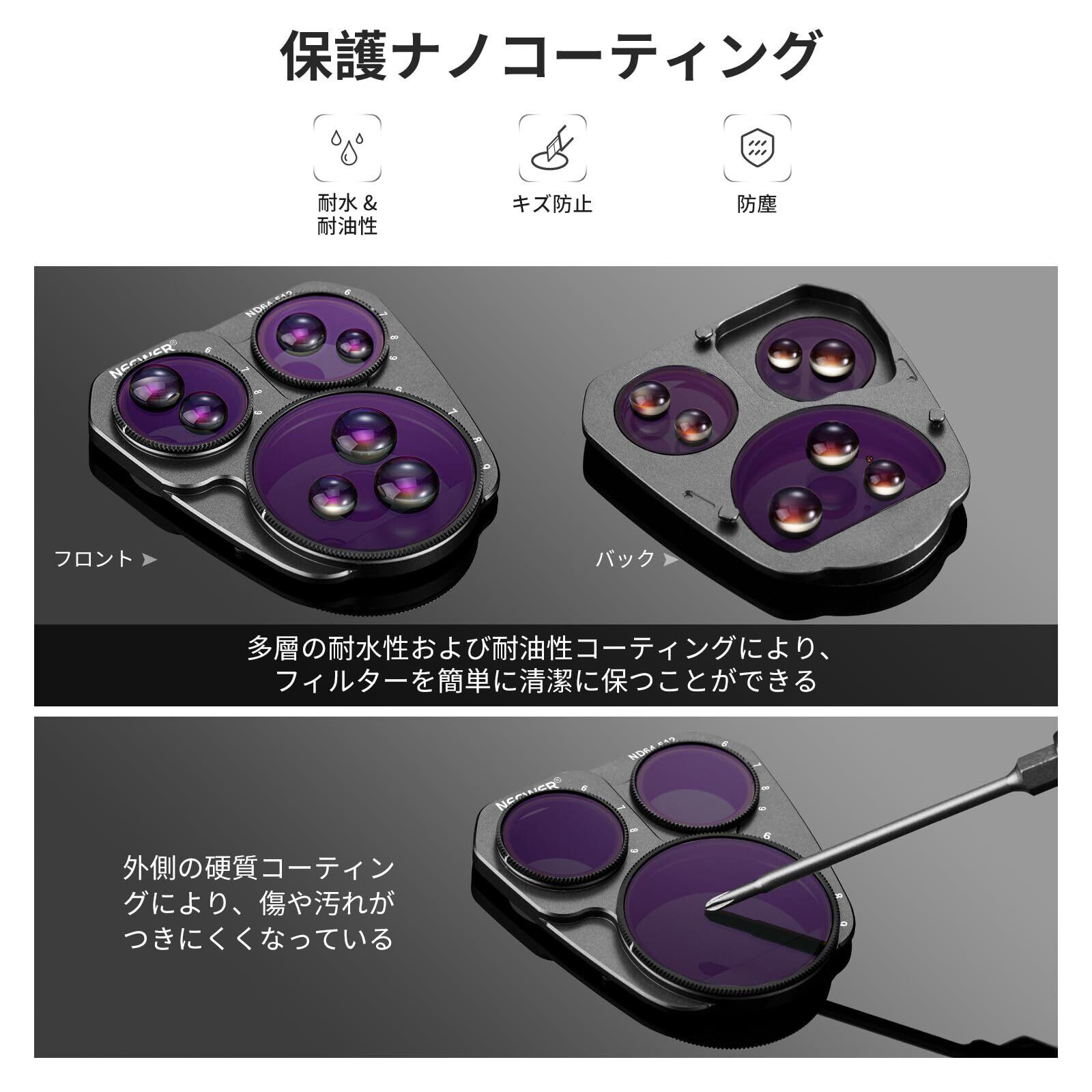 【NANOコーティングHD光学ガラス】HD光学ガラスの両面に30層の多機能NANOコーティングを施したこれらのフィルターは、防水性、耐傷性、耐油性を備えています。