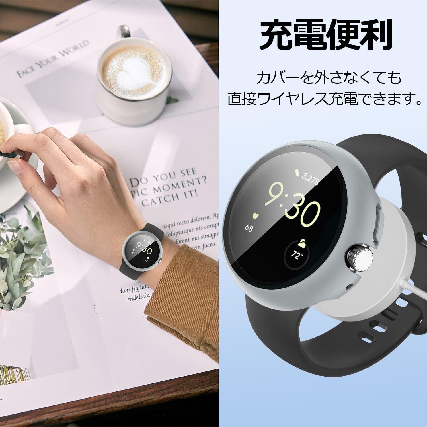 「装着のままで充電できる」背面はくりぬかれているので、ケースをつけたまま充電が可能です。対応機種:Google Pixel Watch 2 / グーグル ピクセル ウォッチ2/Google Pixel Watch 1/グーグル ピクセル ウォッチ1