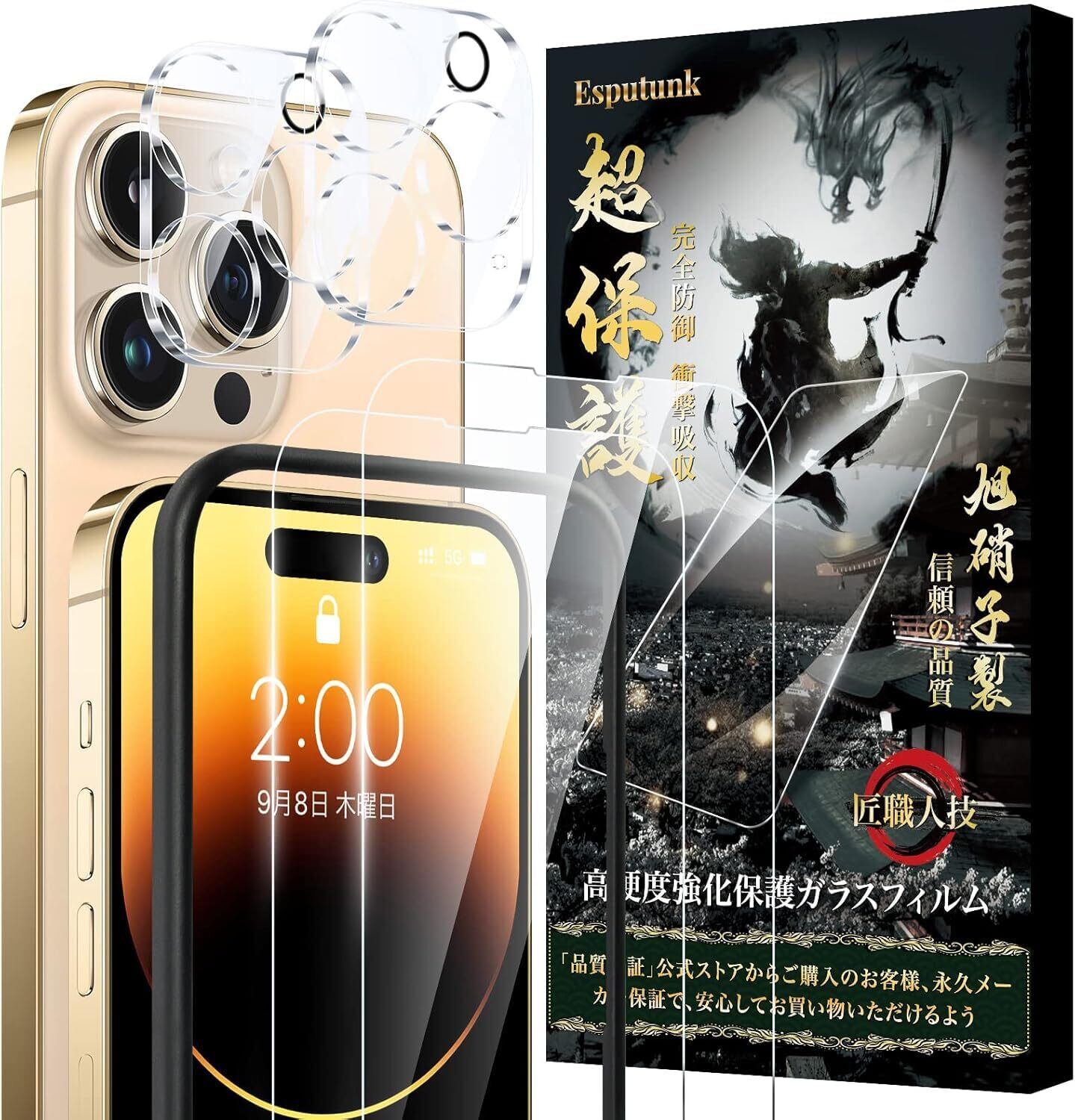 Esputunk iPhone14 Pro ガラスフィルム (2枚)+ iPhone14 Pro カメラフィルム(2枚) 【日本旭硝子素材製-4枚 全面保護 ガイド枠付き】 高透過率 硬度9H 極薄0.28mm 耐衝撃 飛散防止 自動吸着 気泡/指紋防止 撥水撥油 アイフォン14プロ ガラスフィルム+アイフォン14プロ レンズフィルム 6.1インチ