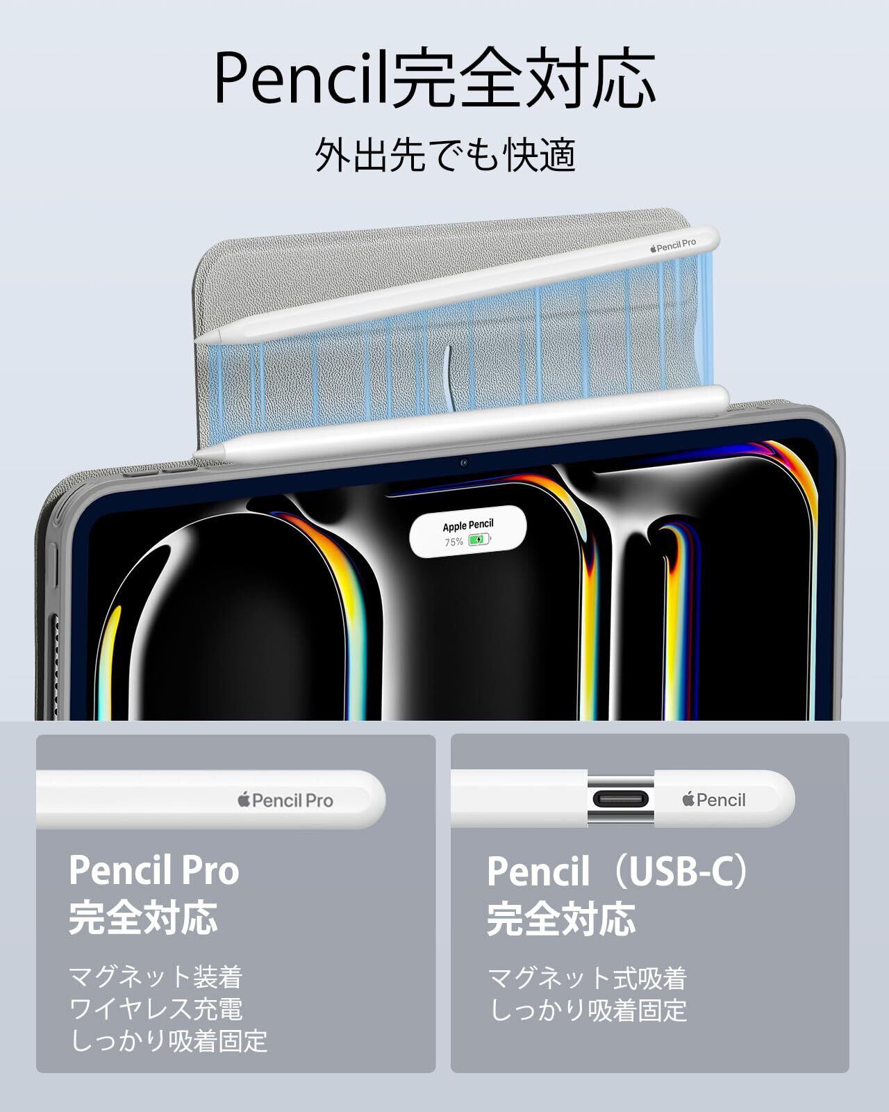 【Pencil Pro&Pencil (USB-C)対応】:Pencil Proへ完全対応かつ、磁気充電用の側面の溝と、Pencilをしっかりと固定するマグネットクラスプを備えています