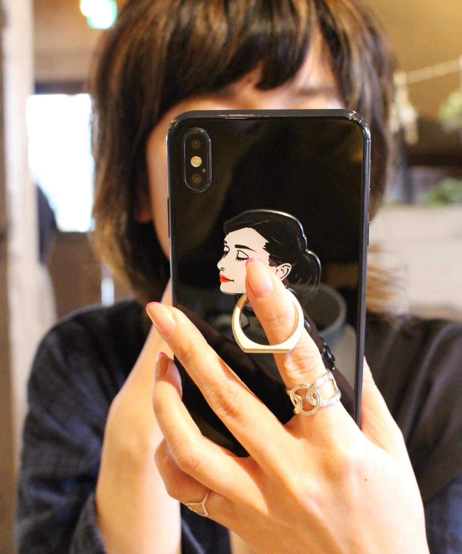 ポップなイラストで描かれるモチーフは、世界的に有名な女優オードリー風オリジナルキャラクター。 リングを指に通せば、スマホを片手で持って落とす心配がなくなります。