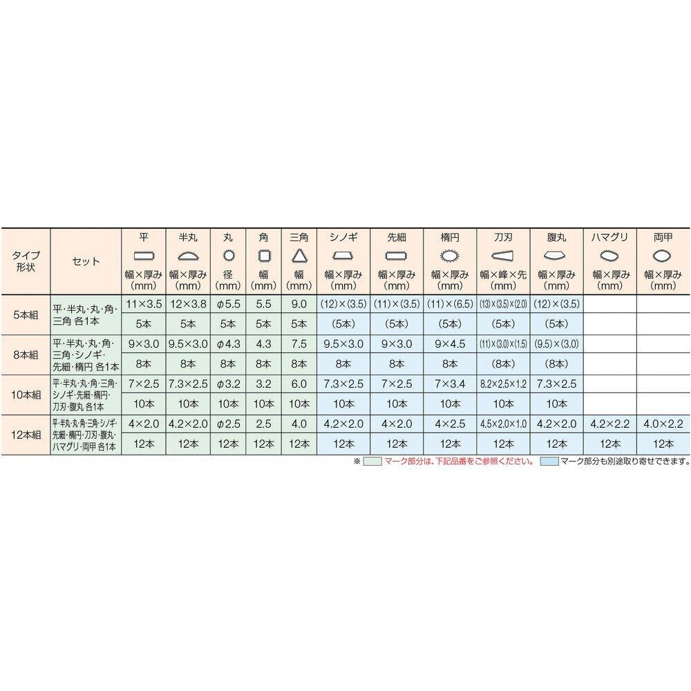 ●組ヤスリの5本組~12本組は全長を表します。5本組=215mm 8本組=200mm 10本組=185mm 12本組=170mm