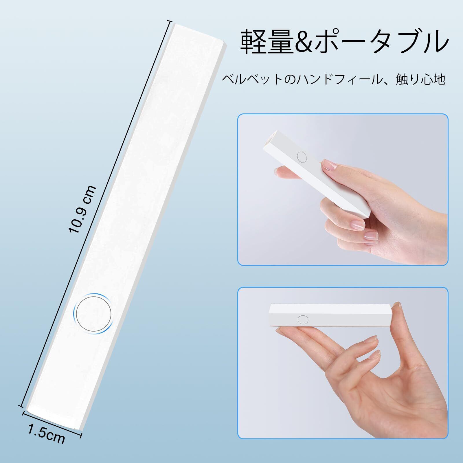 【軽量・持ち運び可能なレジン ライト】 10.9×1.6×1.6 cmのミニマリストデザインで、どこにでも持ち運べ、ビジネス旅行でも旅行でも、リュックサックに無理なく簡単に入れて、いつでもどこでもネイルアートの旅を楽しめるミニLEDネイルランプです!