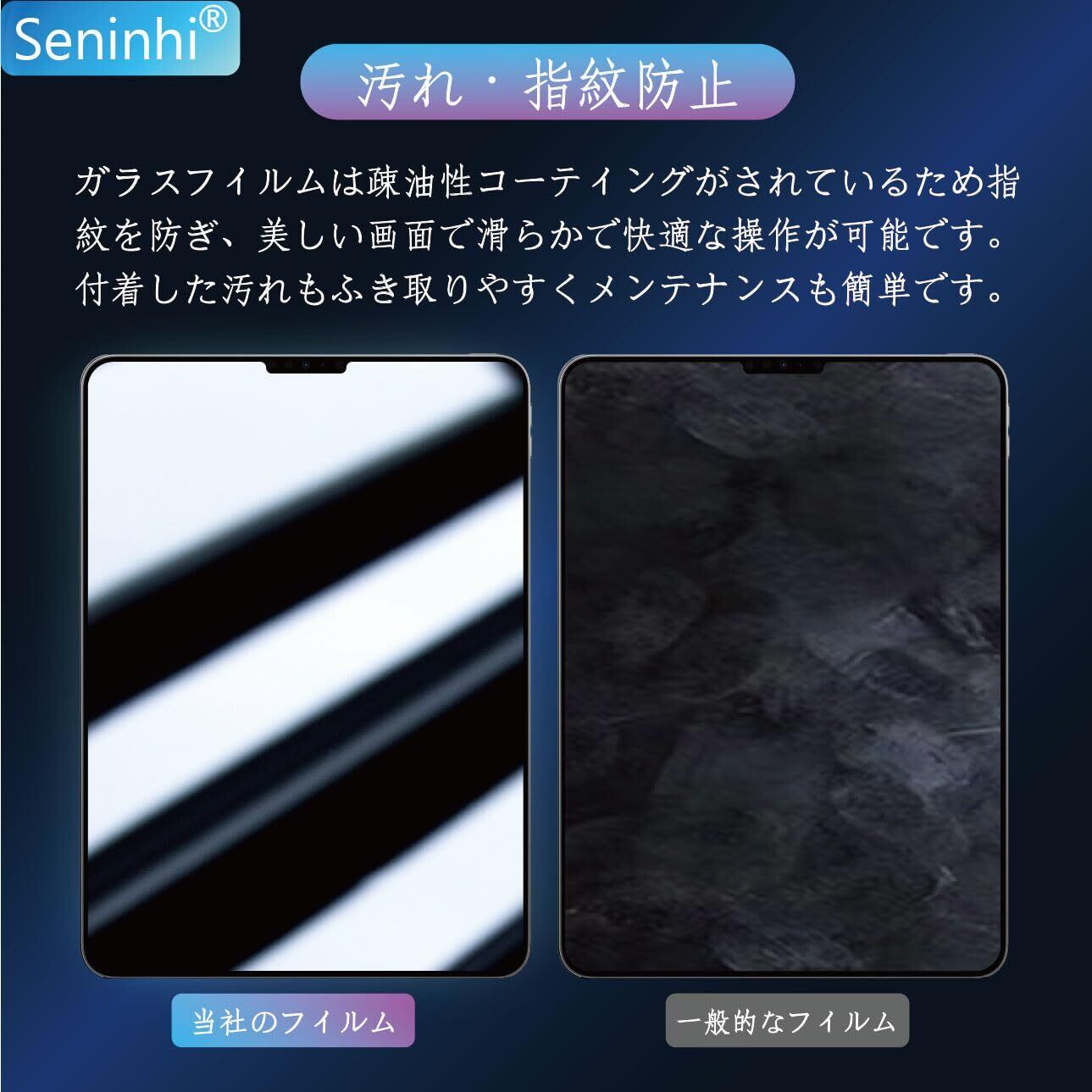 【貼り付けやすい・油防止・指紋防止】seninhi強化フィルムのセットには、位置決め用のガイド枠を付属しておりますので、位置決めが簡単になり、フィルムの自動吸着機能を使って初心者さえも簡単に貼り付けることができます。更に気泡も入りにくいです。フィルムを貼る前に、ホコリ取りシールで細かいホコリを取り除き、気泡の防止をお勧めします。更に私たちの強化ガラスフィルム表面にナノポリマーコーティングを設計しており、これにより油防止、指紋防止できます。汚れや油などが付いでも、簡単に軽くだけできれいになります。