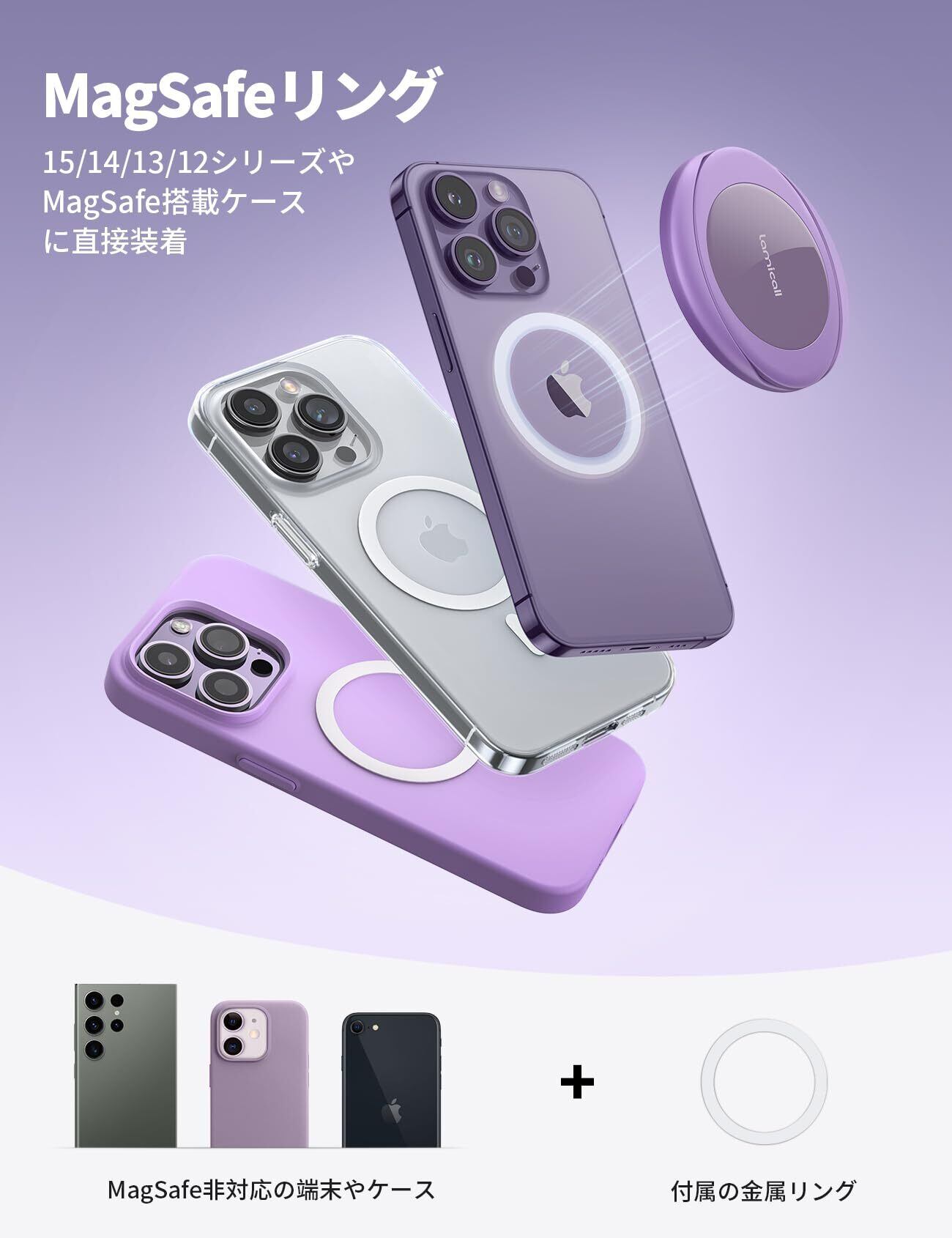 【MagSafe非対応・利用可能】Samsung Galaxy, LG, Sony Xperia, HUWEI, XiaomiなどのAndroidスマホで、本品は強力な粘着力があるメタルリングが添付されます。AndroidスマホやMagSafe非対応ケースもメタルリングを貼り付けたら、本品も使用できます。テープ跡や糊残りを気にせずお使いのスマホをきれいな状態でご利用いただけます。また、マグセーフリングを取り外すだけで、充電できます。メタルリングを利用した場合でも熱くなりませんが、ご安心ください。