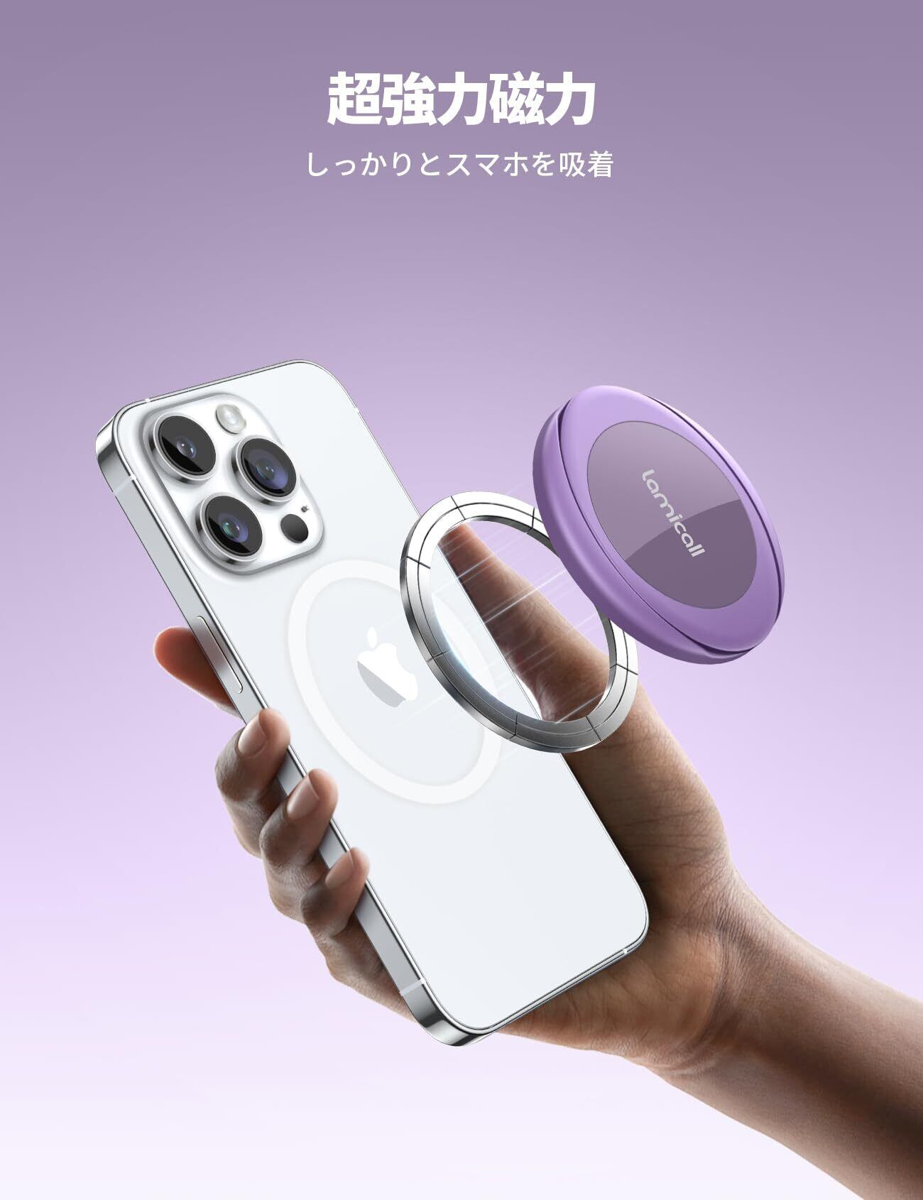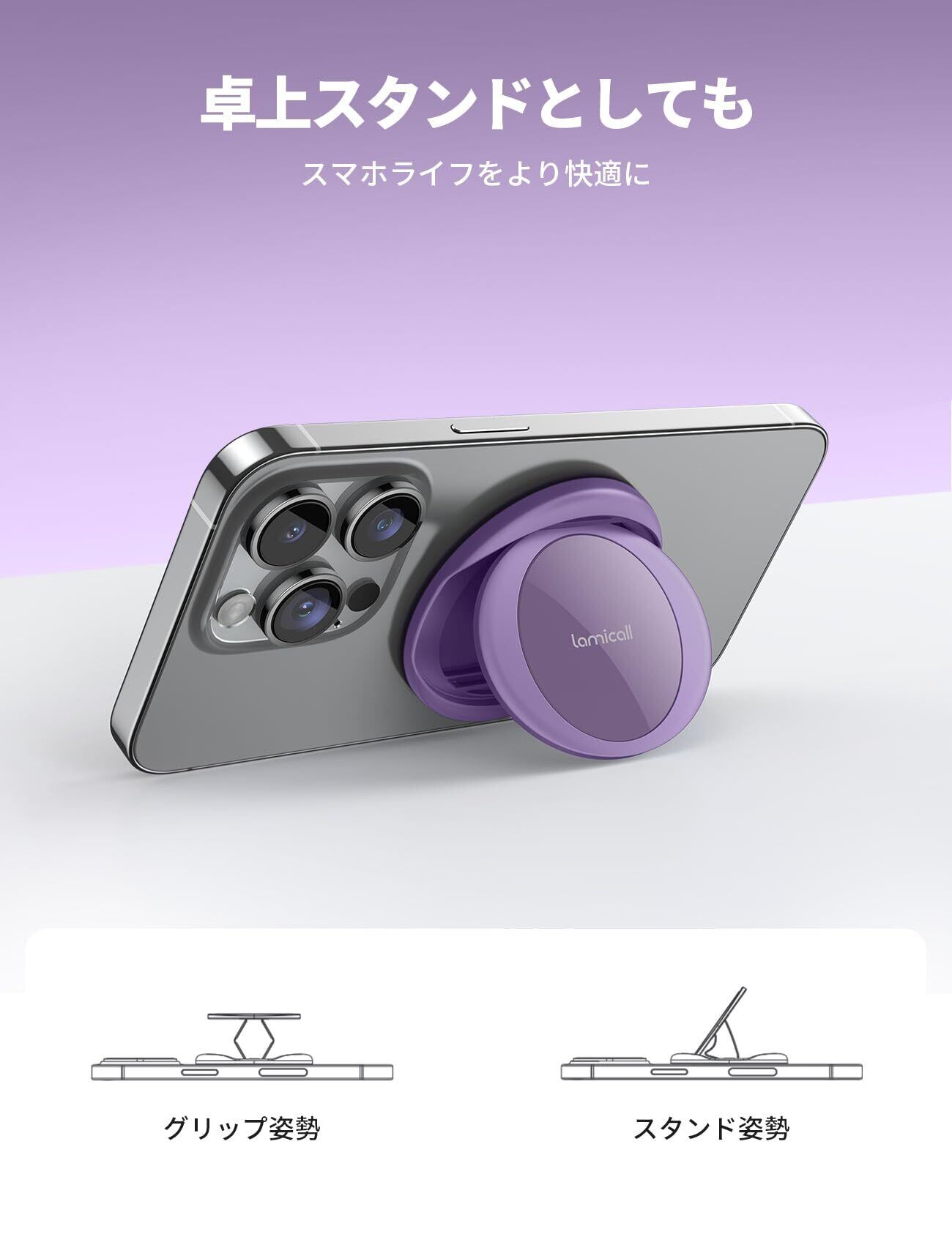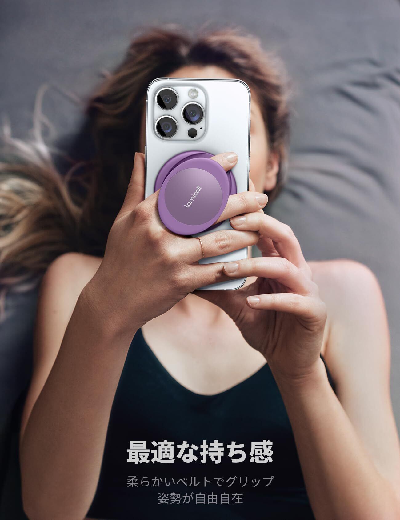 【指が痛くならない】 Lamicall マグネット式 スマホ リング ホルダー : iphone マグセーフ バンカーリング 柔らかいベルト 携帯 グリップ スタンド機能 強力 磁気増強 メタルリング付き 取り外し可能 Magsafe対応 iPhone 16 16 Plus 16 pro 16 pro max iphone 15 14 13 12 mini アンドロイドxiaomi に対応 紫