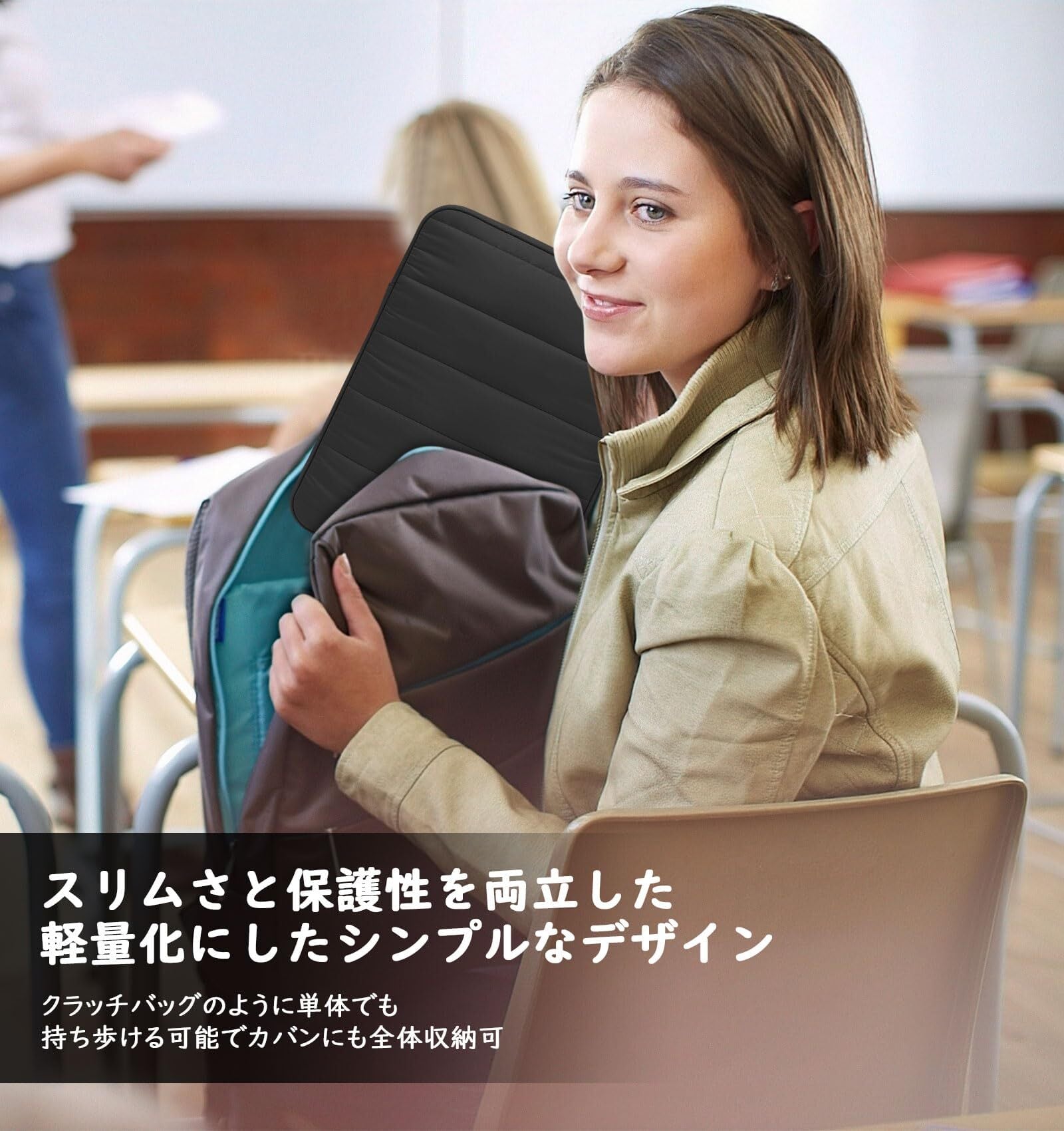 「様々な場合に適用できるデザイン」スリムさと保護性を両立したシンプルなデザインに仕上げたタブレットケースは使い勝手のよい仕様になっているため、クラッチバッグのように単体でも持ち歩ける可能でカバンにも全体収納できます。綿入れのようなふわふわで手になじみやすい滑らかな肌触りが感じられ、装飾を抑えた落ち着いた色合いと秋冬にぴったりな高級感漂うキルティングで仕上げており、日常でもビジネスでも様々な場合に適用できます。
