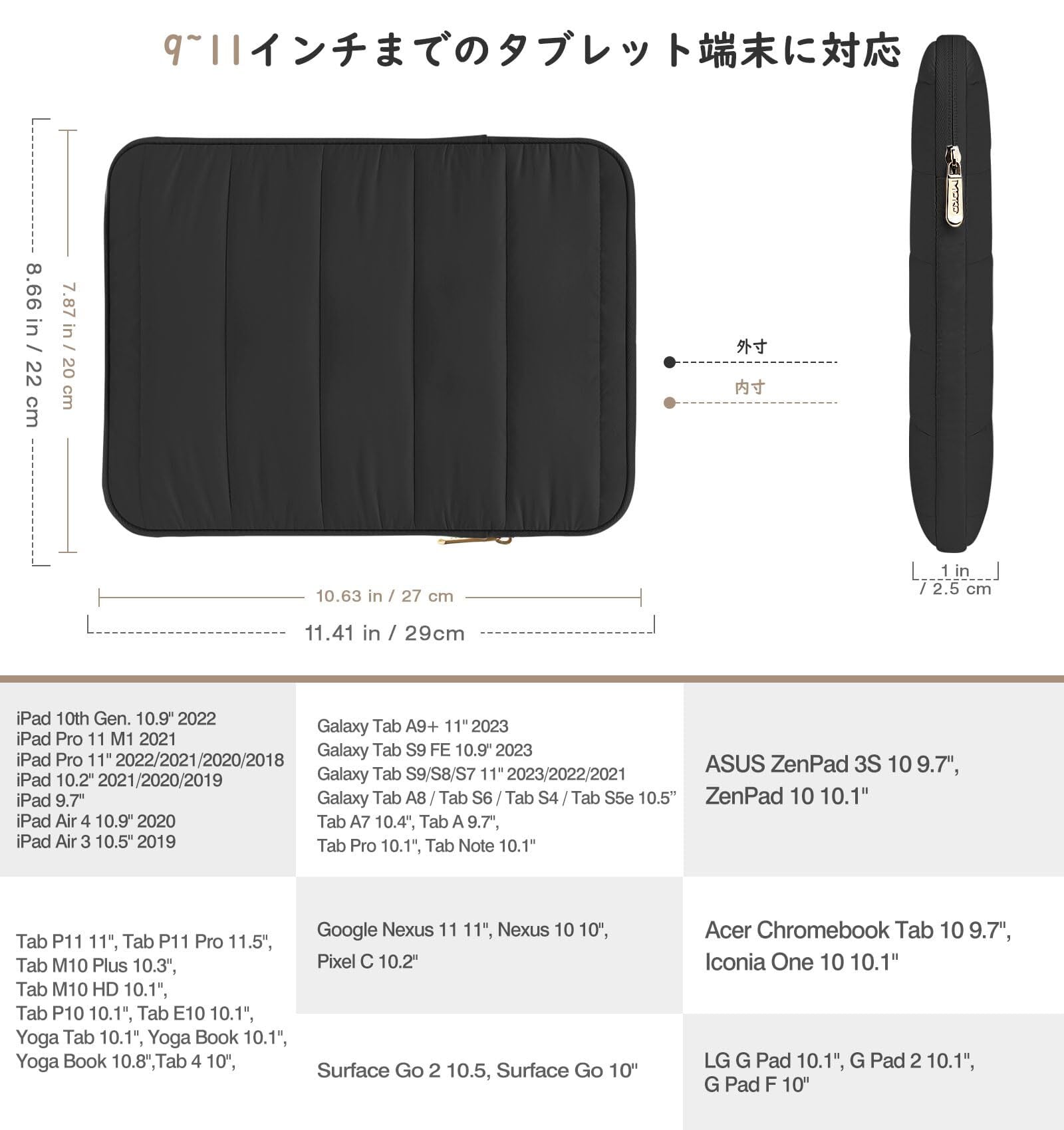 「9~11インチまでのデバイスに対応」当商品は外寸29*22*2.5cmで内寸27*20cmとなる主にタブレットを収納用保護インナーバッグです。iPad Pro M4 2024/iPad Air M2 2024/iPad Air 5/4 10.9/Air 3 10.5/iPad 10/ iPad 9/8/7 10.2/Galaxy Tab S8/S9/S9 FE/Tab A9+/Surface Go 2/3 10.5/Fire HD 10/10Plus/Fire max 11 2023などの9~11インチまでのノート・タブレットPCに適用しております。ご購入になる前に、お使いのデバイス機種モデルと寸法をしっかりと確認してください。