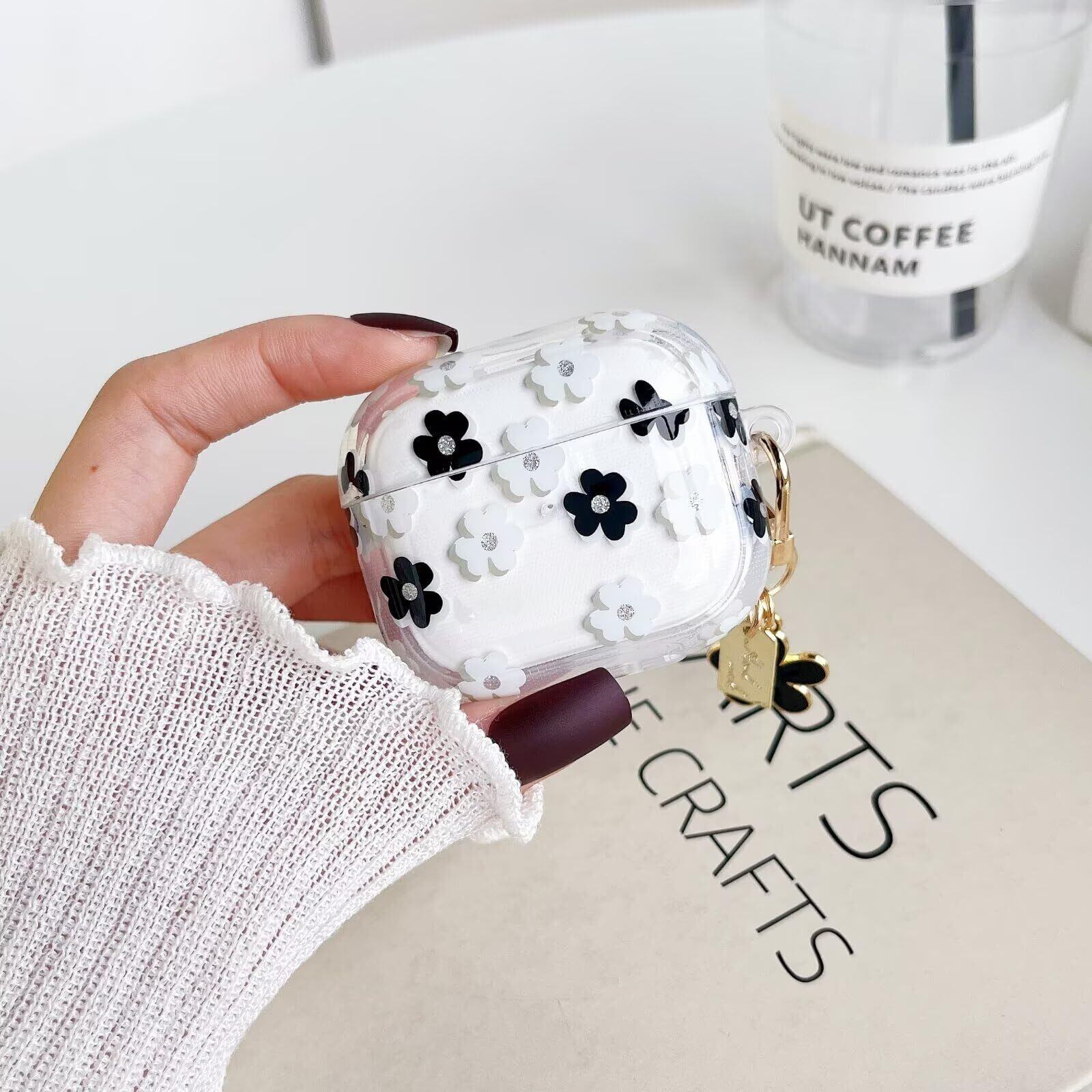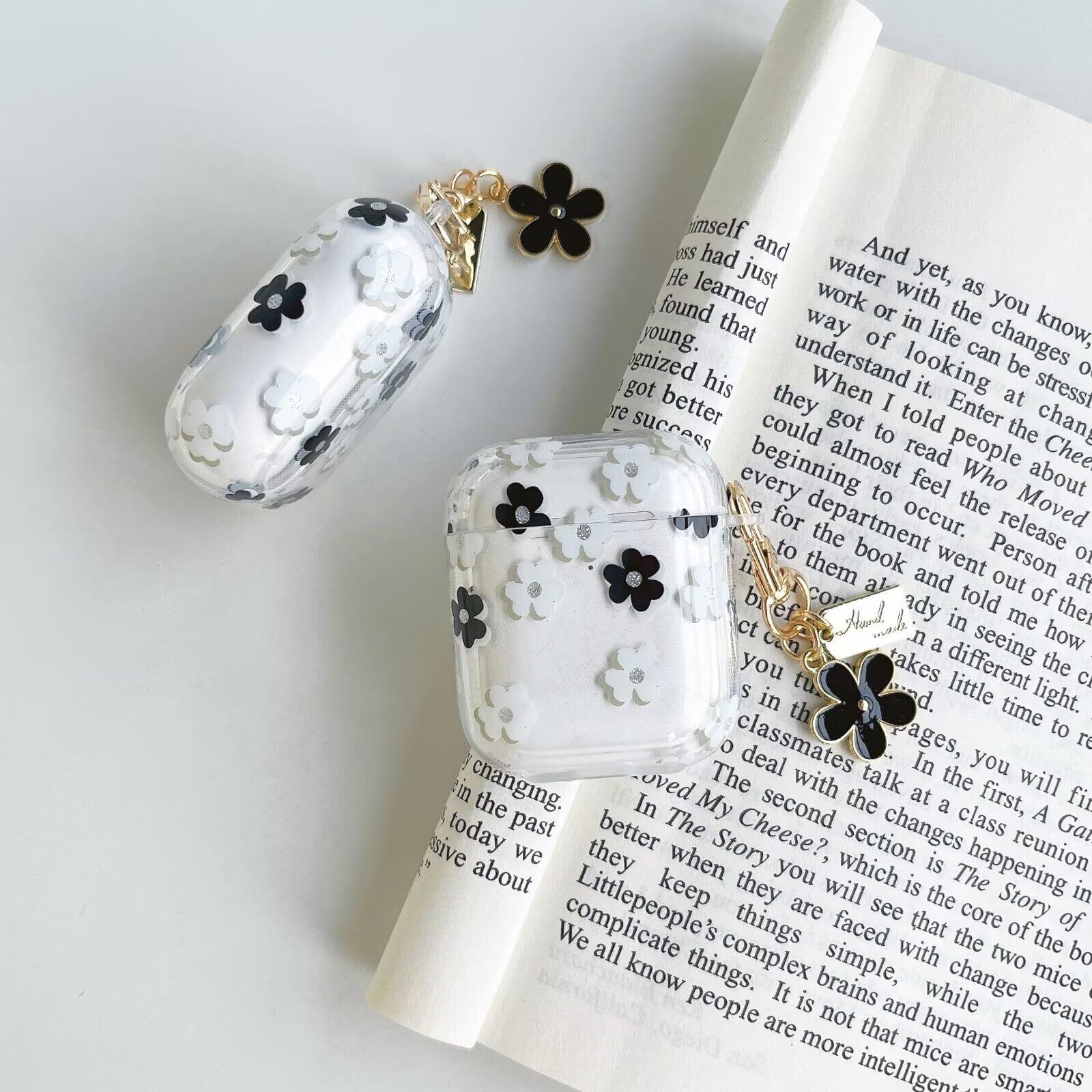 TanMay 適用 Airpods 4 ケース クリア シリコーン かわいい ブラック ホワイト 花 花柄 デザイン 透明ケース おしゃれ ペンダント/キーチェーン 付き 可愛い 人気 レディース 女性用 ソフト TPU エアポッド4 ケース