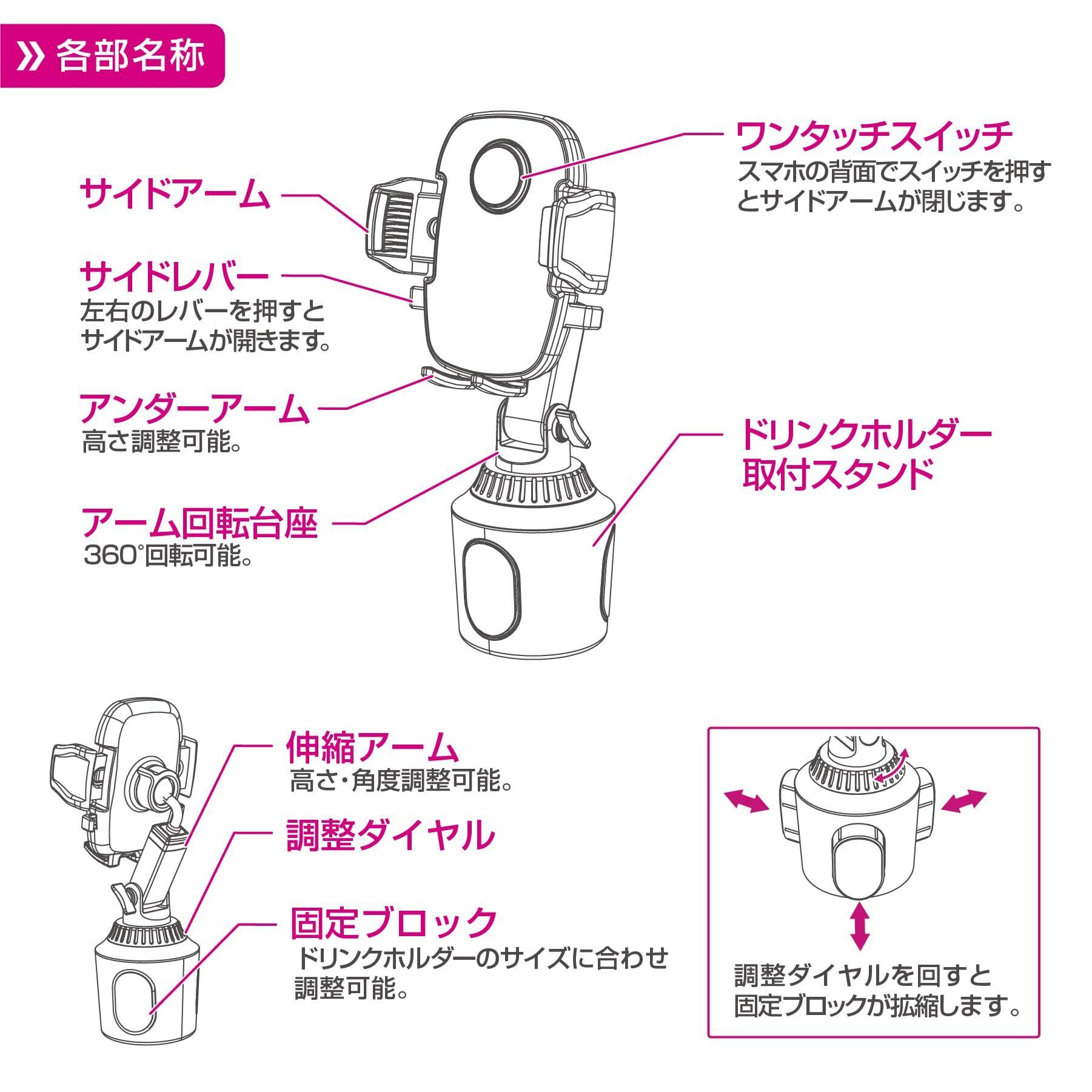 【対応スマホサイズ】幅:約55~88mm/厚み:約20mmまで/ホルダー部耐荷重:約280g以下【セット内容】ホルダー本体×1/ドリンクホルダー取付スタンド×1/取扱説明書