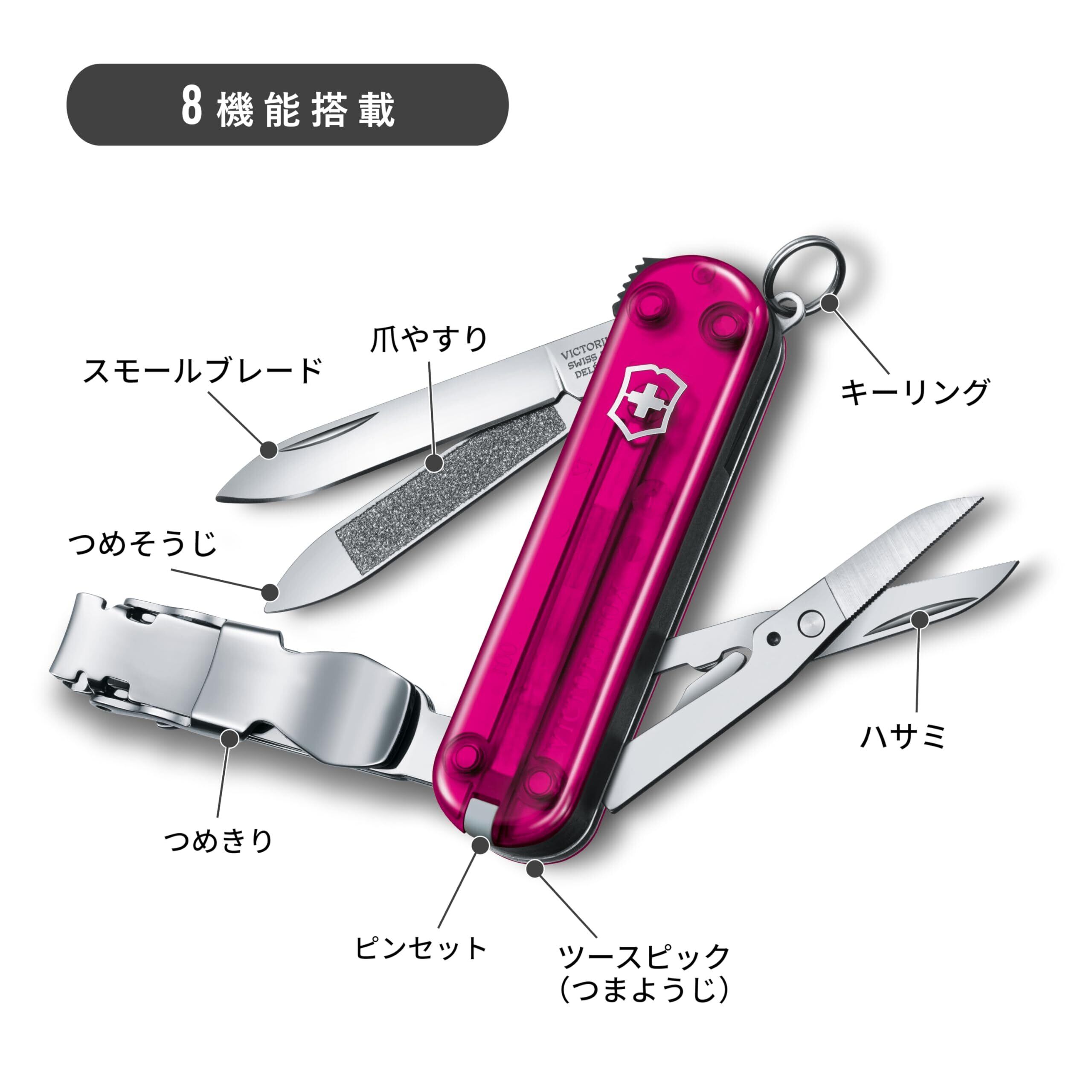 機能数8: つめ切り、ブレード( 刃体の長さ: 約4㎝ )、つめやすり、つめそうじ、はさみ、ピンセット、ツースピック、キーリング