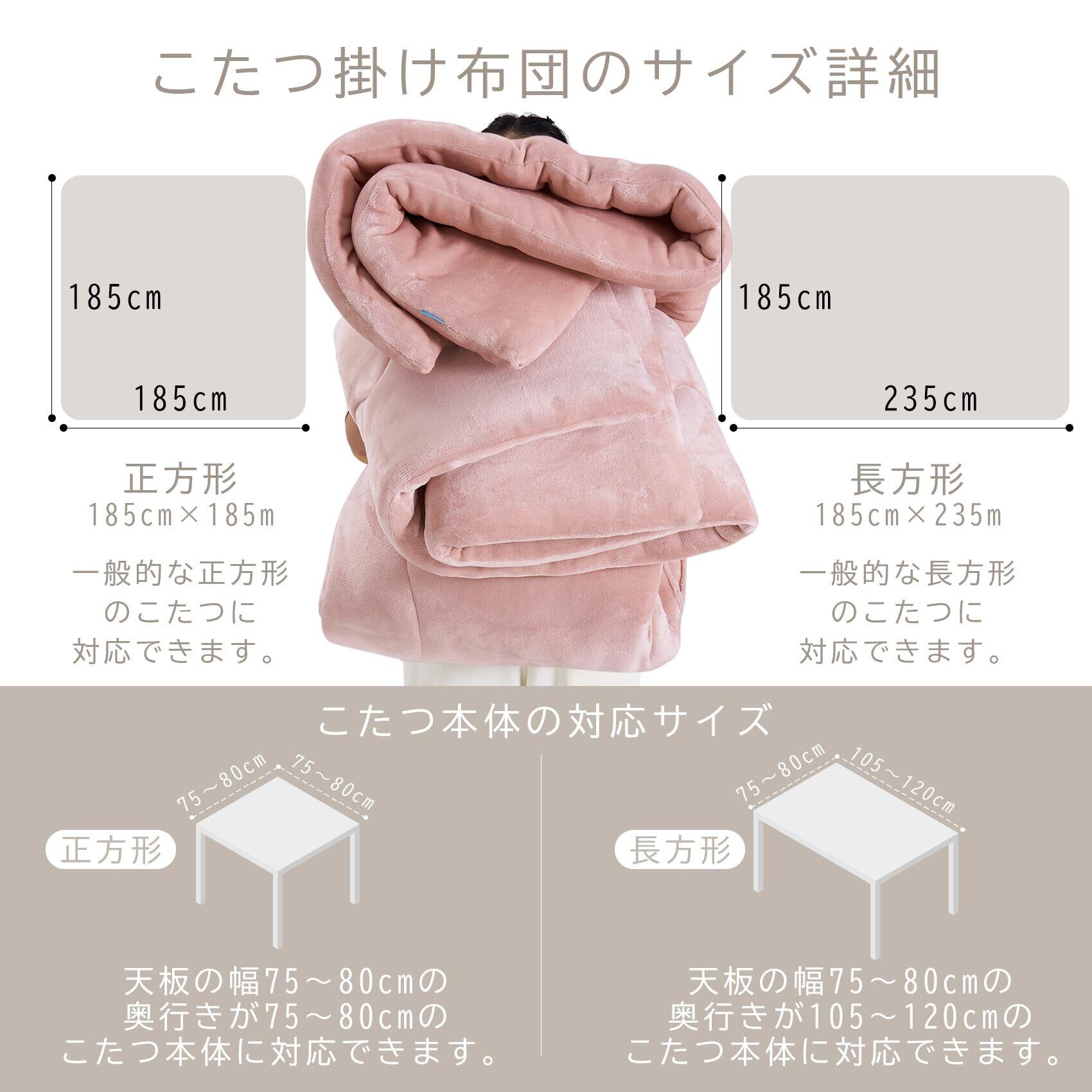 【こたつ本体の選択】(185cm×185m/185cm×235m)の対応サイズは天板の幅:75~80cm,奥行きが(75~80cm/105~120cm)のこたつ本体に対応できます。注:本製品はこたつ掛け布団の単品のみです。
