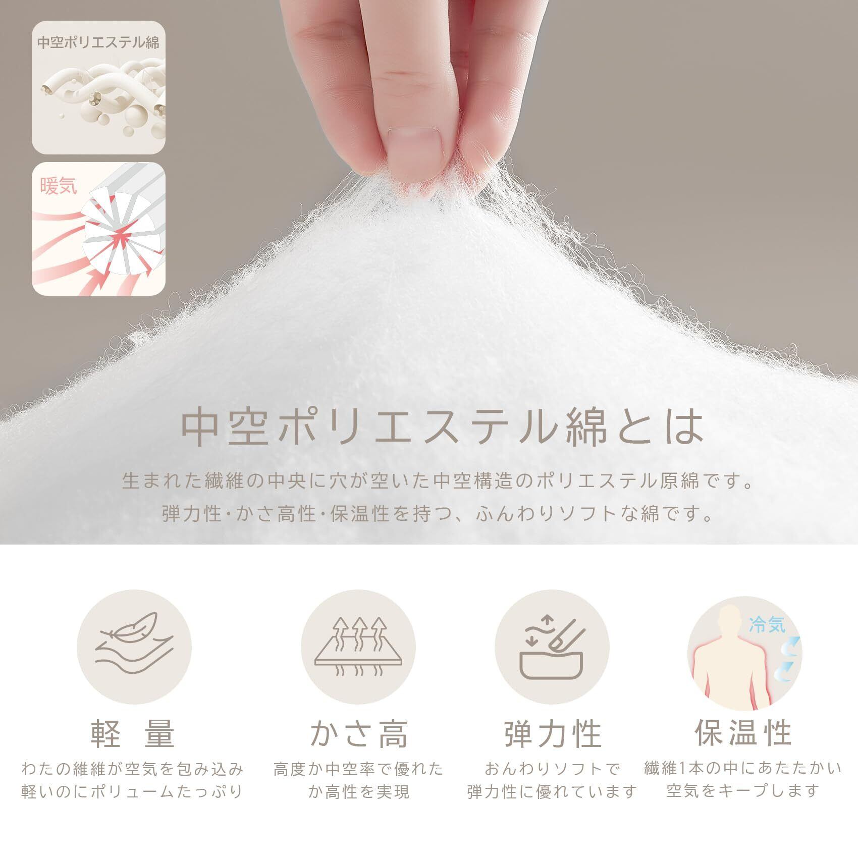 【中空ポリエステル綿】中空ポリエステル綿とは生まれた繊維の中央に穴が空いた中空構造のポリエステル原綿です。弾力性·かさ高性·保温性を持つ、ふんわりソフトな綿です。ワガママさんにぴったりのちょうどいい厚みとあたたかさを両立したふっくらわた入りこたつ布団です。