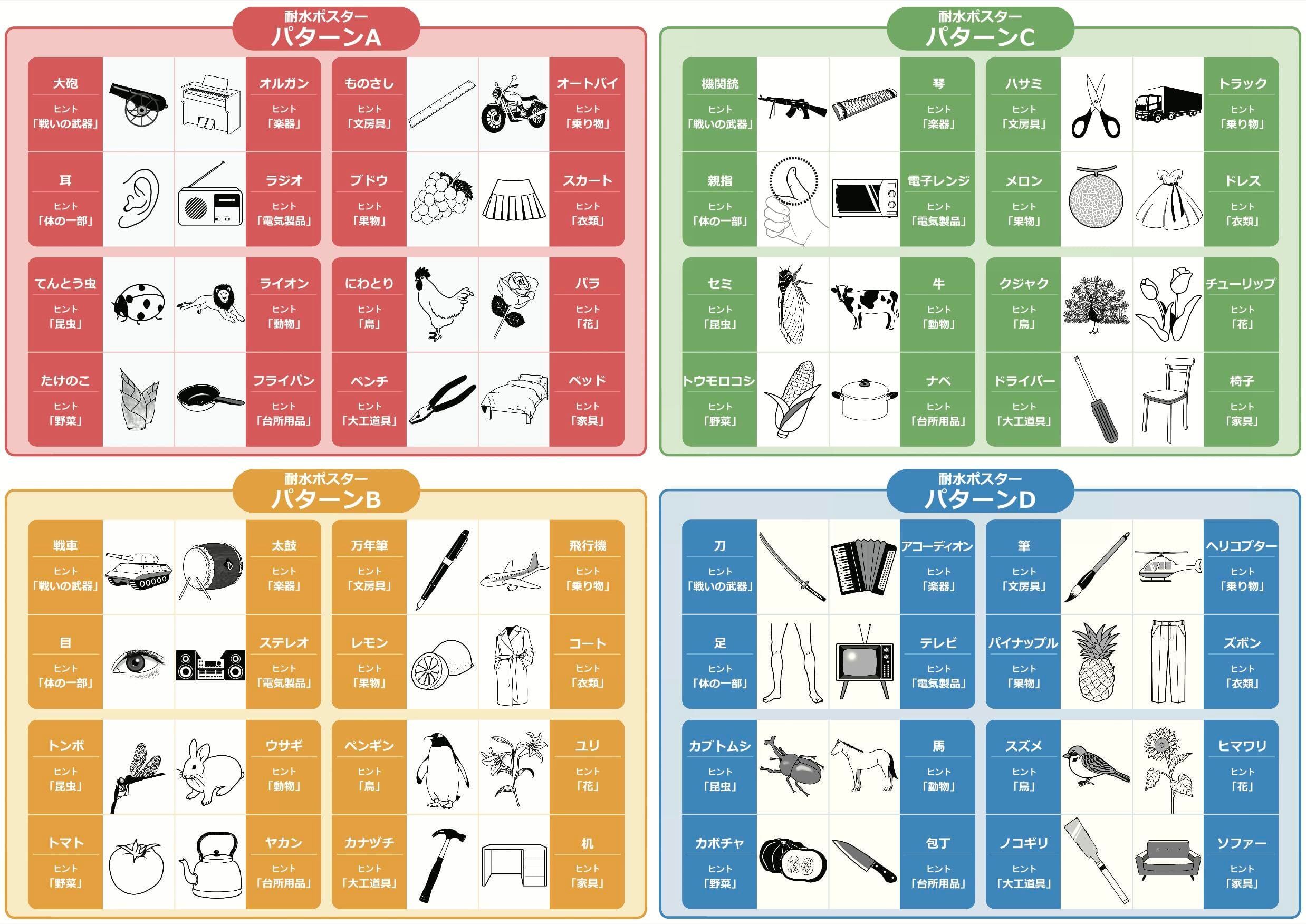 高齢者の運転免許の更新の際に受検する「認知機能検査」に出題される全64種類のイラスト一覧表のお風呂ポスターです。 4つのイラストパターン(A・B・C・D)それぞれ1枚、A4サイズのポスターが合計4枚のセットになっています。 今回のお風呂ポスターは屋外ポスターに利用される水に濡れても破れにくい「ユポ紙」を使用しています。 特典として認知機能検査の手がかり再生のヒント別・イラスト別の不正解率データをお付けしますので、ぜひ参考にしてみて下さい。※こちらは耐水ポスターではありません。