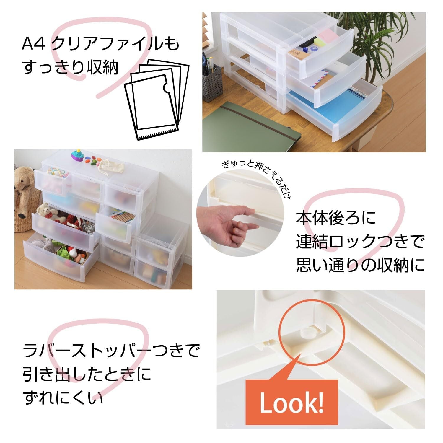 サンカ ポスデコ 引き出し収納ボックス A4 3段(浅2深1) クリア ずれを防ぐラバーストッパー 重ねて使える スタッキングチェスト ロック機構 日本製 カラーボックス 収納ケース 小物 衣装 ボックス (幅25.2x奥行35x高さ32.4cm) NpdA4-a2f1CL | BASE SHOP