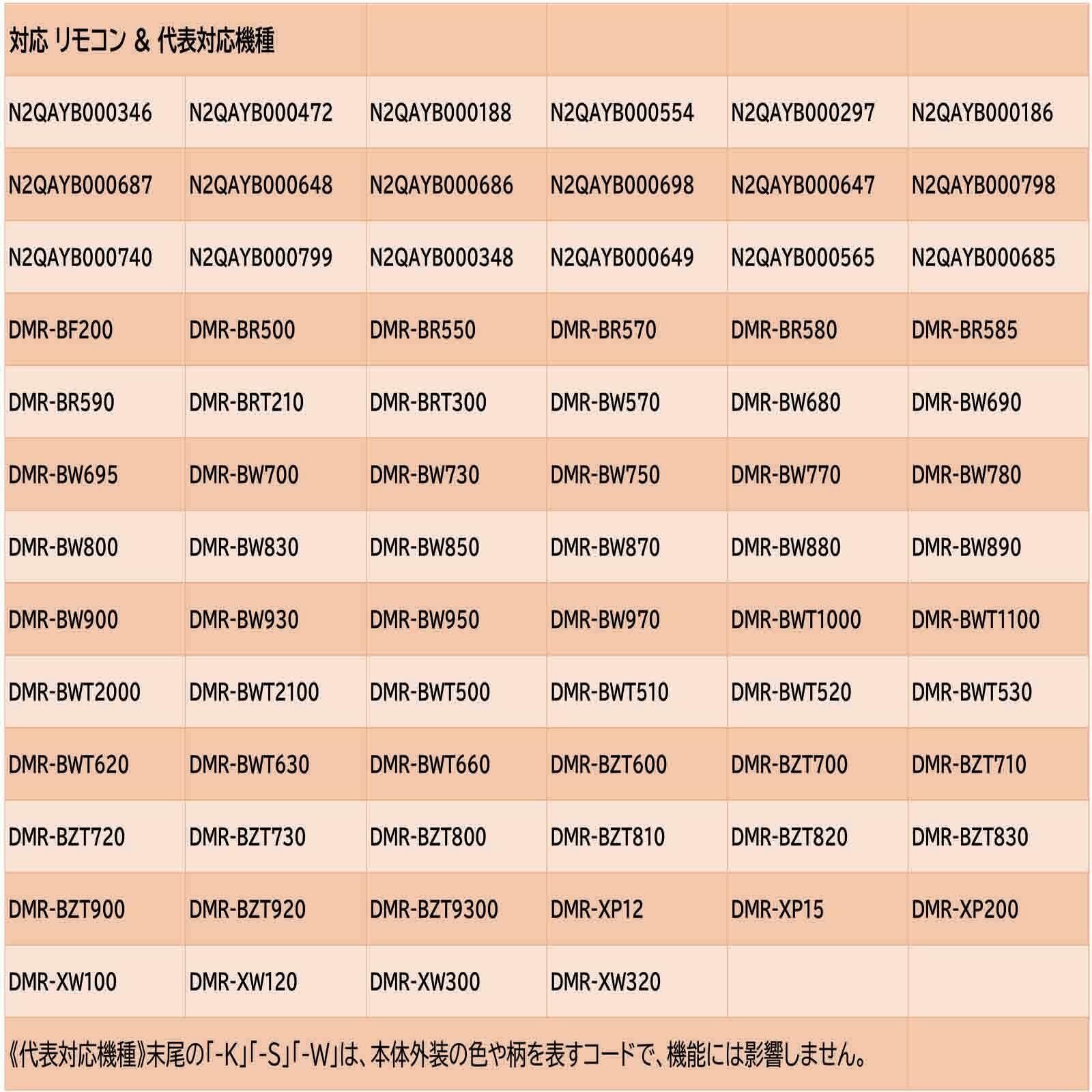 ◆ 代表対応機種:DMR-BZT600 DMR-BZT700 DMR-BZT710 DMR-BZT720 DMR-BZT730 DMR-BZT800 DMR-BZT810 DMR-BZT820 DMR-BZT830 DMR-BZT900 DMR-BZT920 DMR-BZT9300 DMR-XP12 DMR-XP15 DMR-BF200 DMR-XP200 DMR-XW100 DMR-XW120 DMR-XW300 DMR-XW320 ※ 対応機種の型番末尾の色記号、「-K」「-S」「-W」は省略されています,型番を検索する際に色記号を記入しないでください,互換性には影響しません。