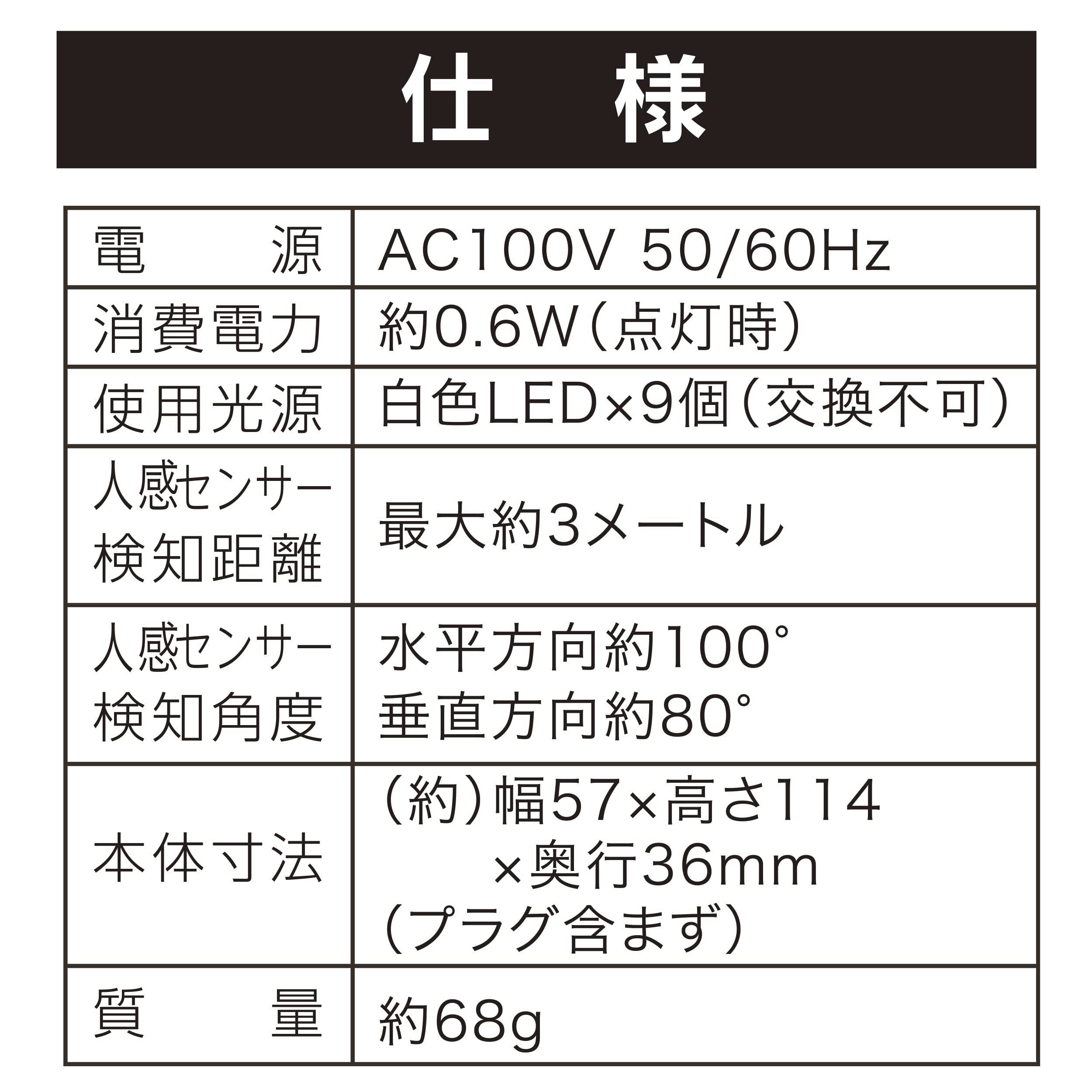 【 仕 様 】 ■ 電源:AC100V 50/60Hz ■ 消費電力:約0.6W(点灯時) ■ 使用光源:LED×9個(交換不可) ■ 人感センサー検知距離:最大約3メートル ■ 人感センサー検知角度:水平方向…約100°、垂直方向…約80° ■ 本体寸法(約):幅57×高さ114×奥行36mm(プラグ含まず) ■ 質量(約):68g ■ 点灯色:電球色