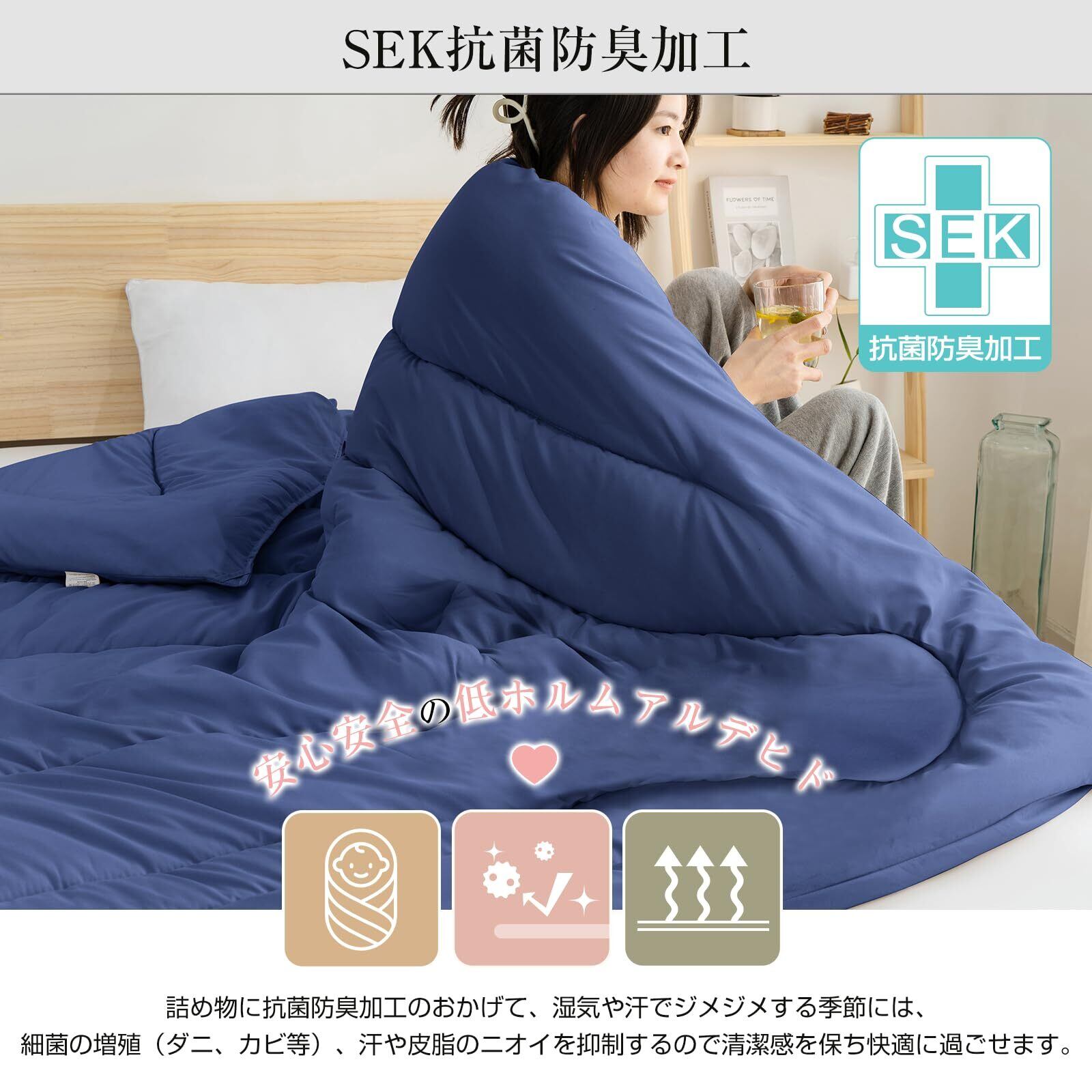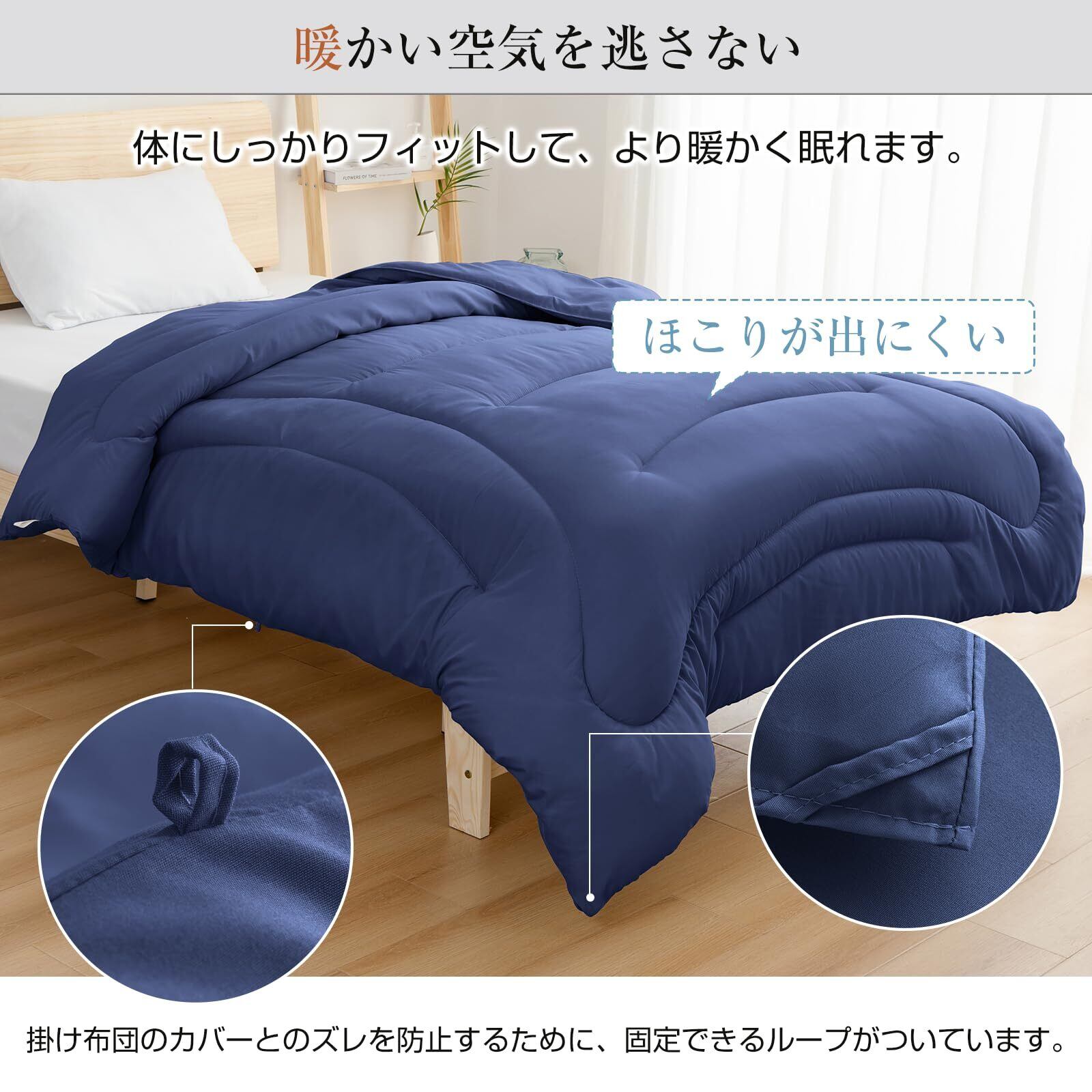 【中空構造のポリエステル綿】「中空ポリエステルわた」を採用しているので、繊維一本一本に空気をたっぷり含みますので、保温性にすぐれ、ほこりもでにくくなります。ふわっと暖かくて体への負担を感じさせません。通年使う布団に最適な素材です。ズレ防止用ループが付いているので、お布団がズレる心配もありません、とても便利です。
