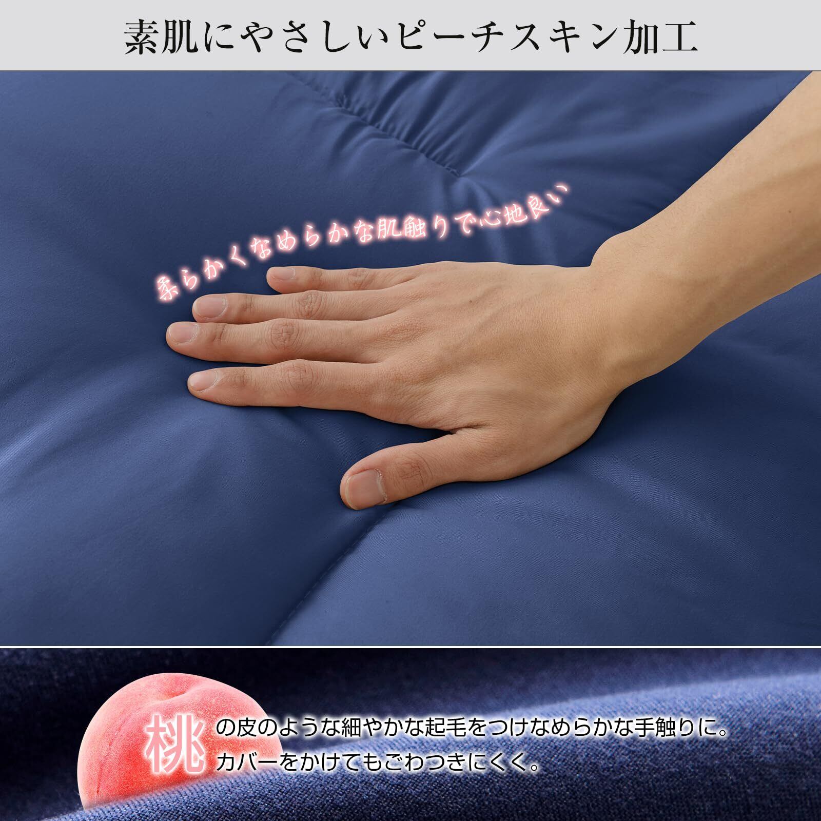 【柔らかい素材】素肌にやさしいピーチスキン加工で、柔らかい素材はソフトな起毛の桃の薄皮のような肌触りの生地です。柔らかくなめらかな肌触りで心地良い。低ホルムアルデヒドで小さなお子様にも安心です。キルティングを身体に沿う形状に、洗っても中身が偏りにくいです。