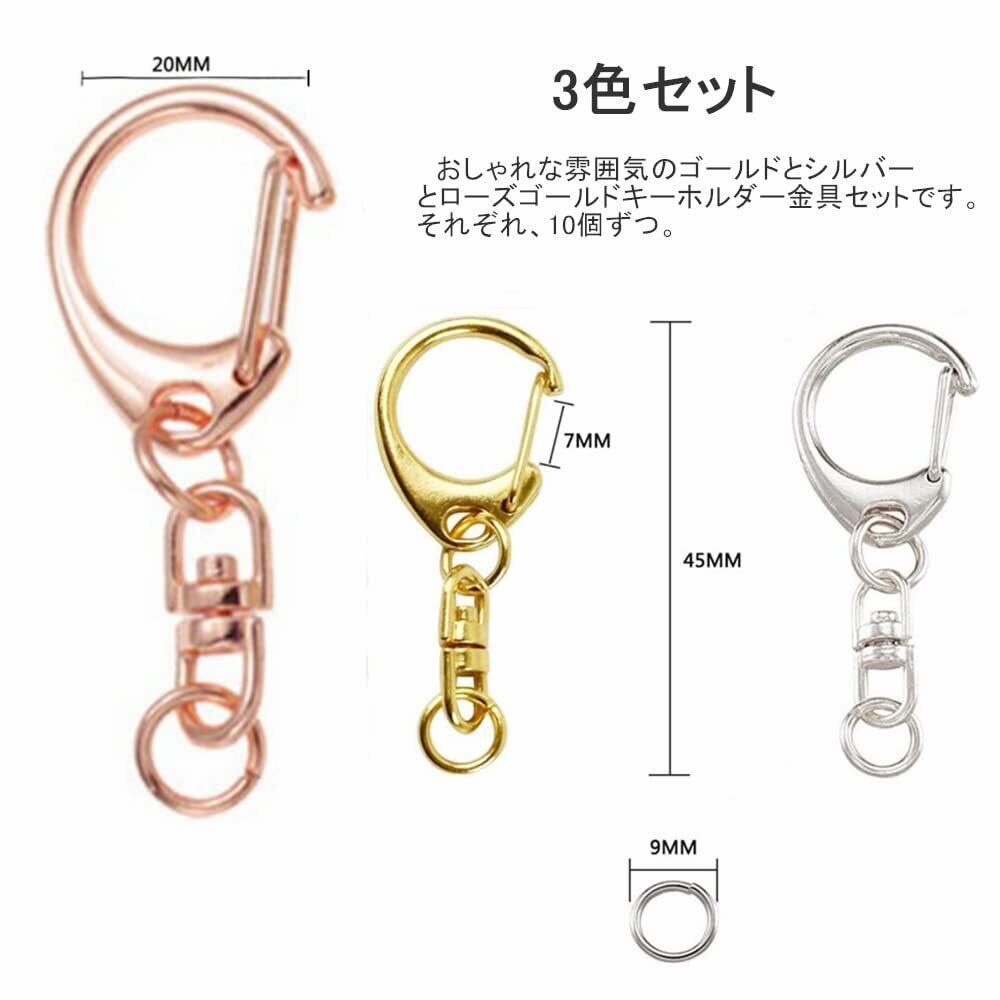 1.おしゃれな雰囲気のゴールドとシルバーキーホルダーとローズゴールド金具セットです、各10個。作りがしっかりして、バネ性も優れ、変形しにくい、丈夫で耐久性高いです。