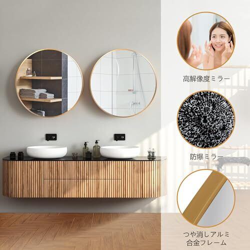 鏡 壁掛けミラー アルミフレーム 壁掛け鏡 バスルームミラー 丸型ミラー 化粧鏡 リビング ウォールミラー 玄関 洗面 トイレ 円形(ゴールド, 直径50cm)